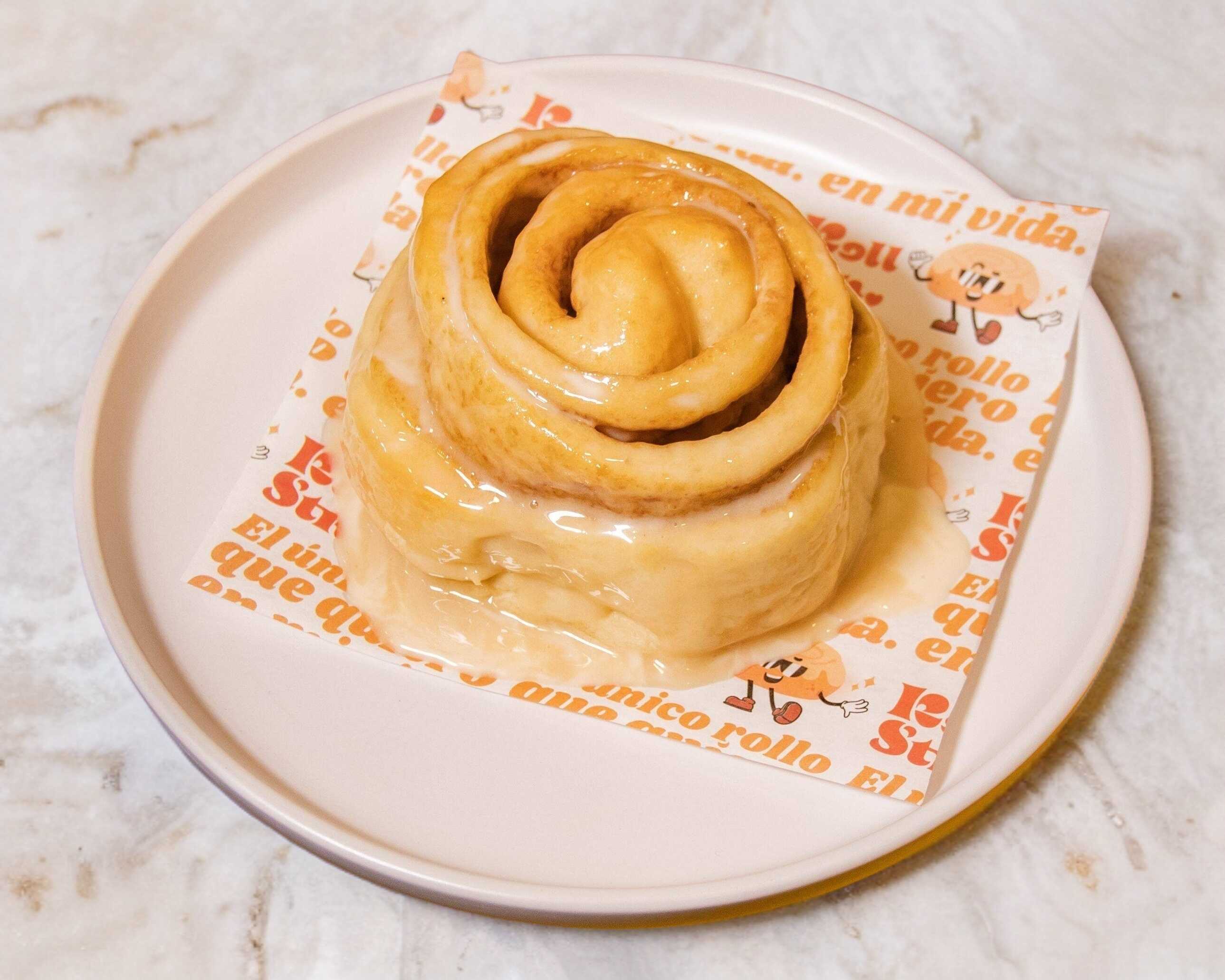 Rol de canela con glaseado de mermelada de fresa y trozos de fresa natural.