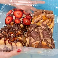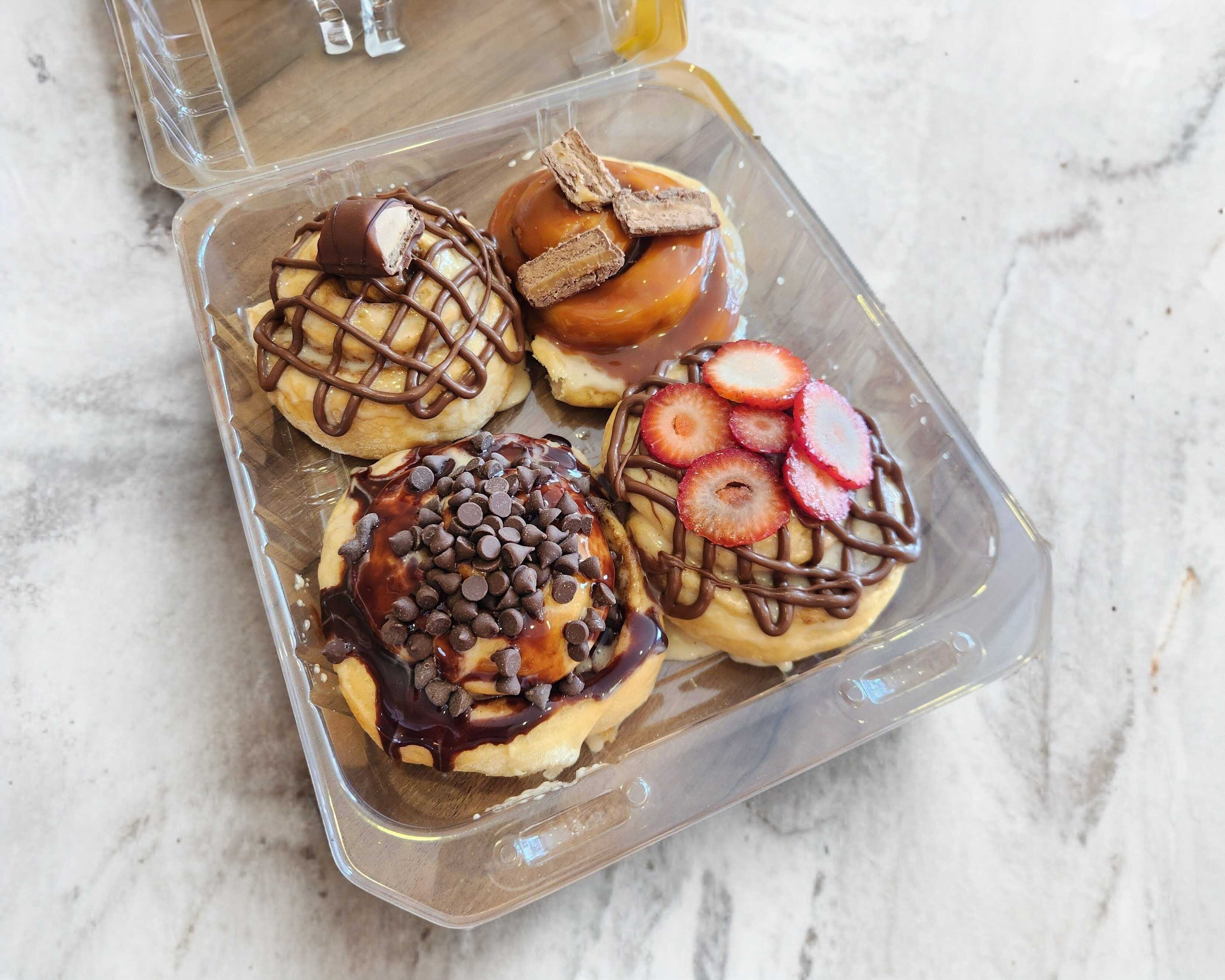 4 roles de canela glaseados con extra toppings (Nutella Kinder, Nutella Fresas, Hersheys con chispas y Cajeta con Milky Way)