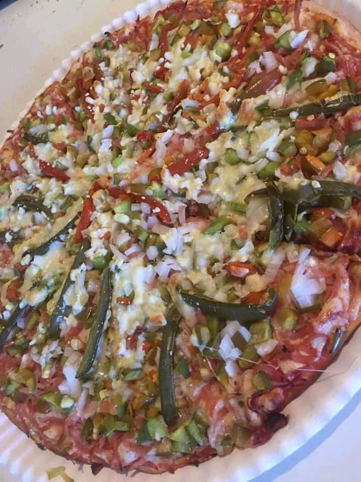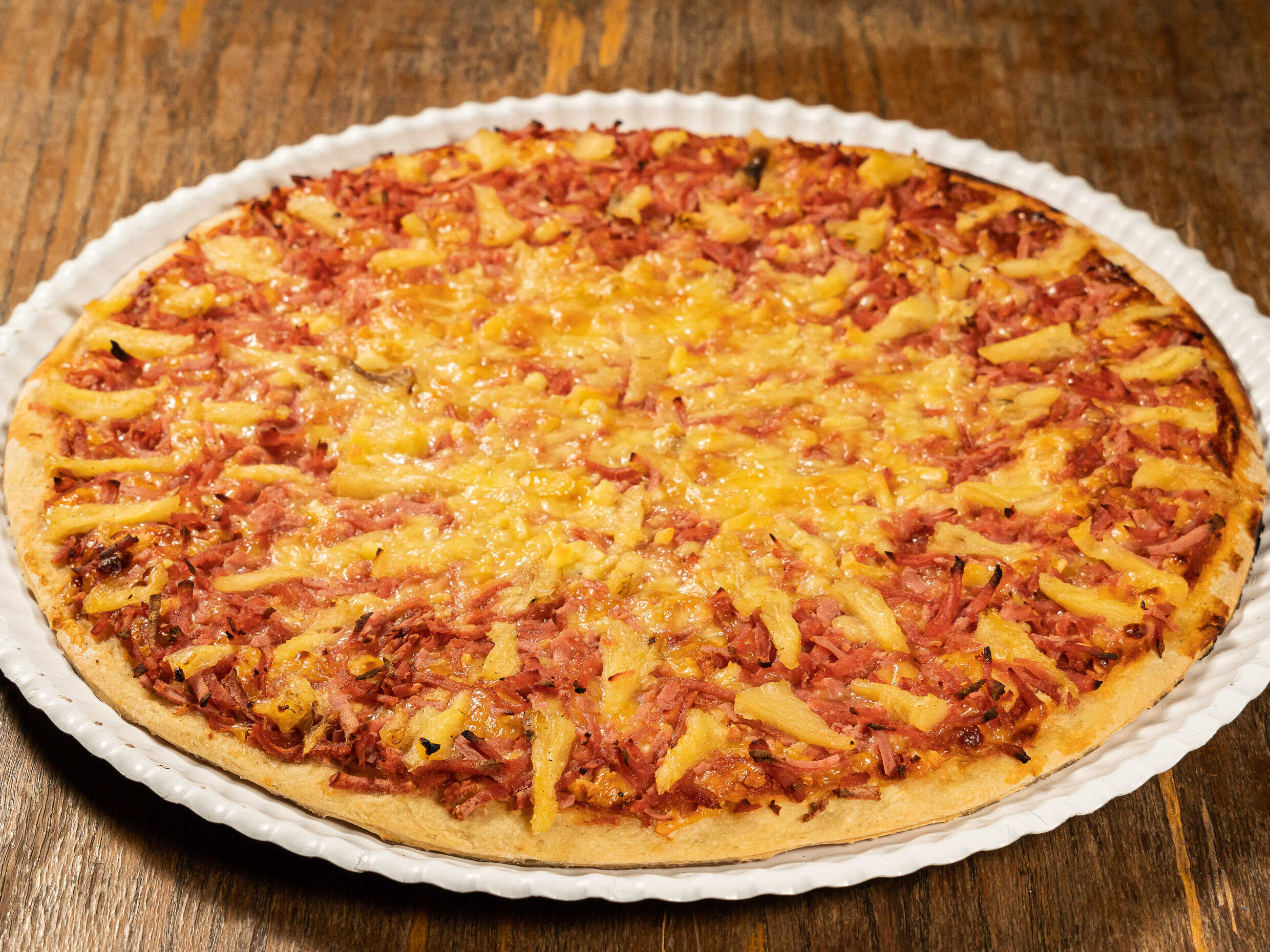 Jamón, chorizo, tocino, salami, champiñones, pimiento y cebolla.