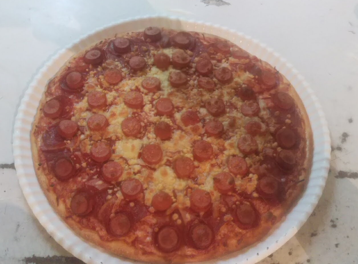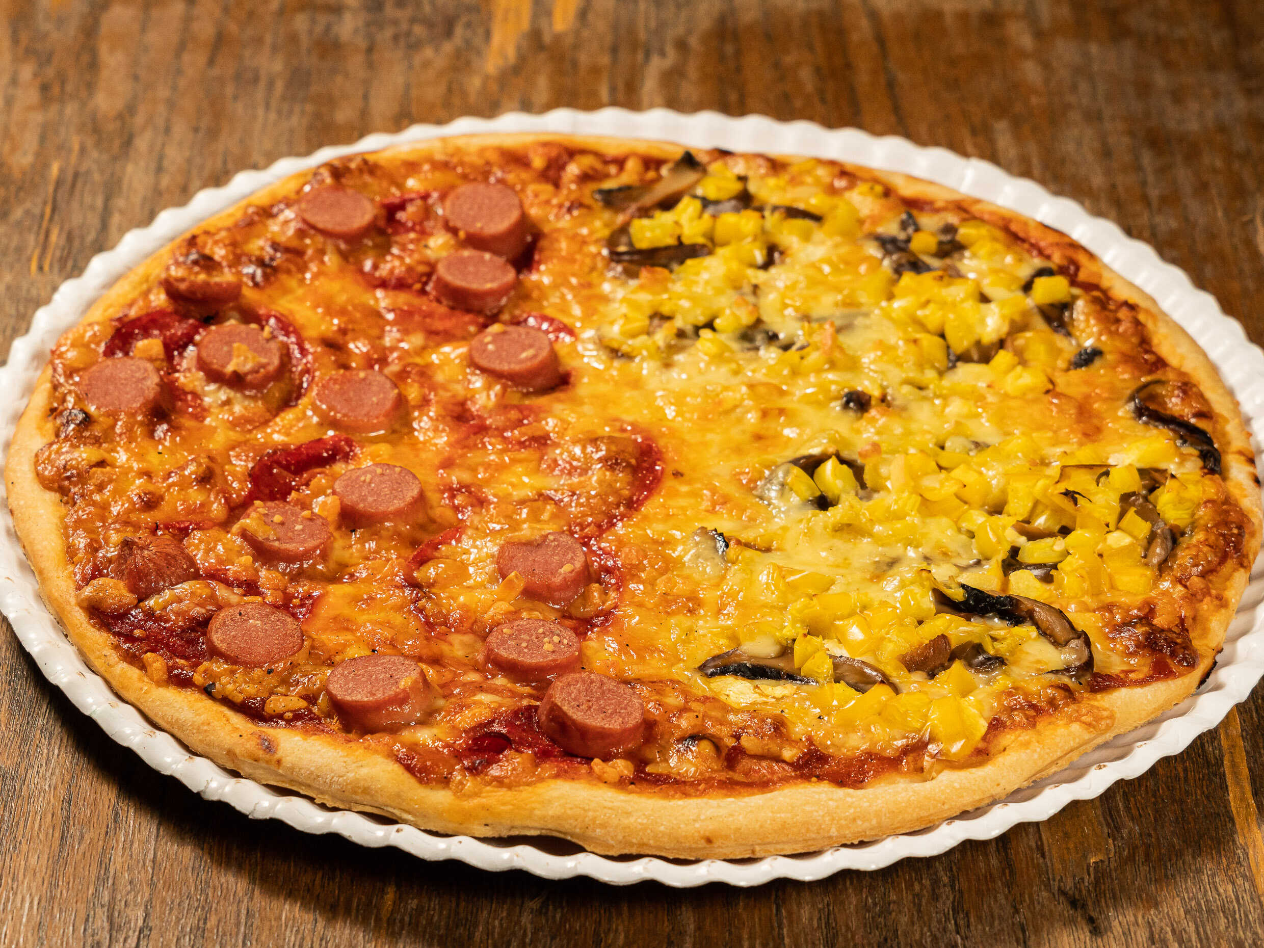 Pizza mitad champiñones con pimiento morrón mitad pepperoni con salchichas Frankfurt