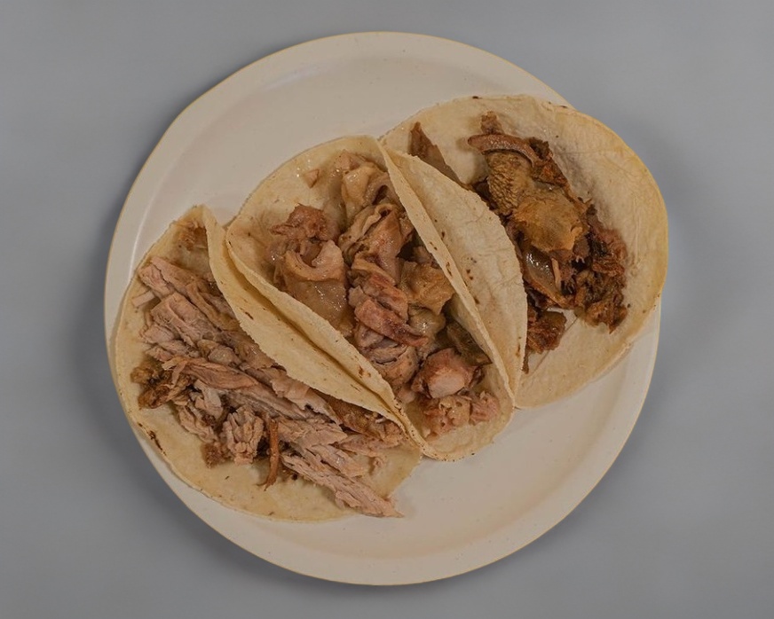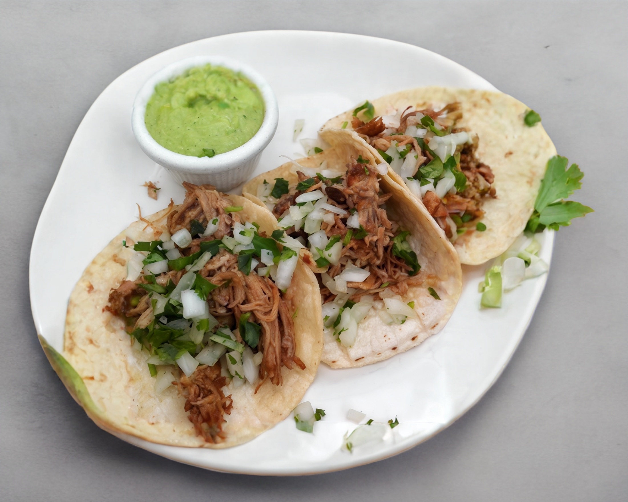 Taco en tortilla de maíz con nuestro exquisito chamorro, cebolla picada, cilantro, limón, salsa y pico de gallo.