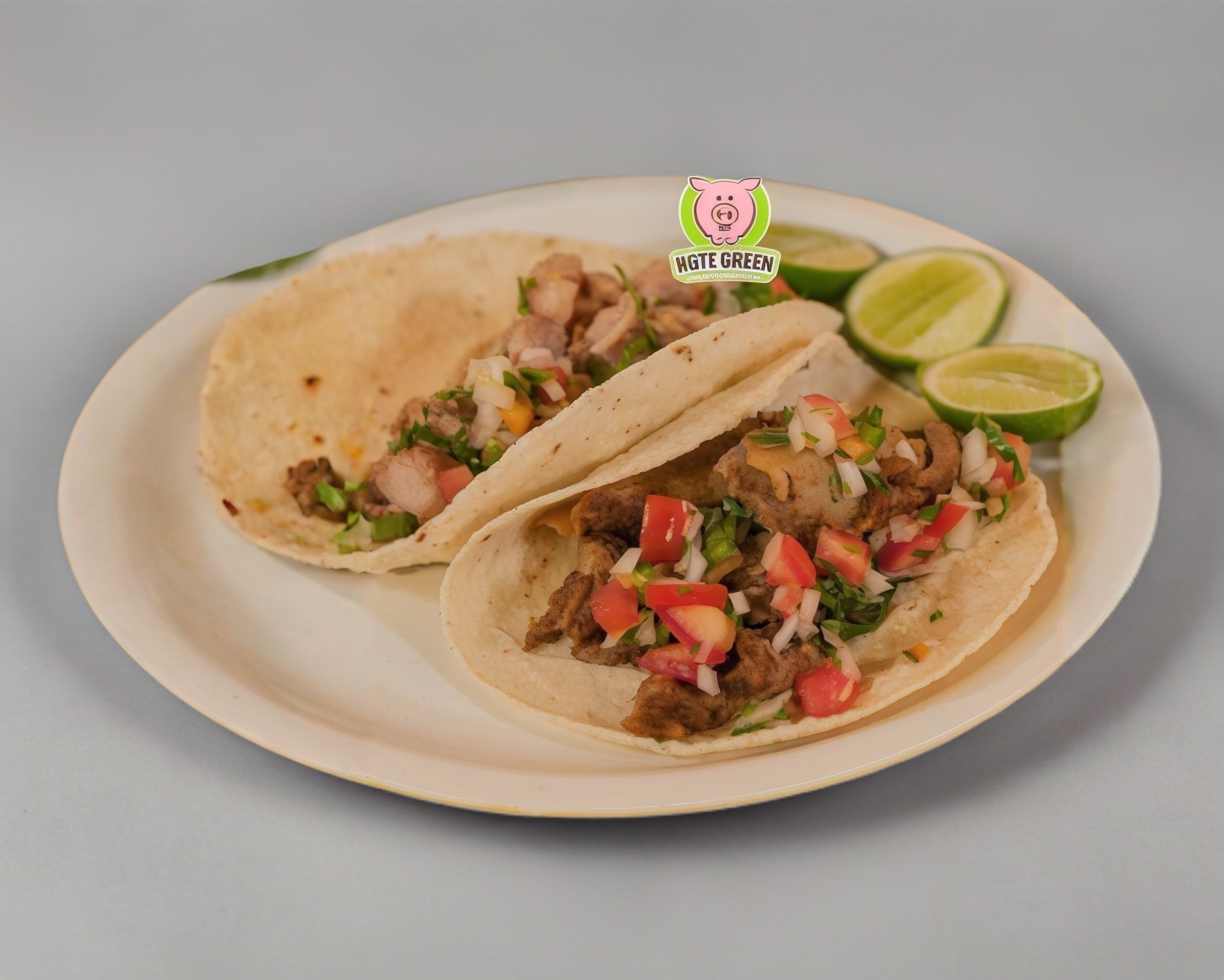 Taco en tortilla de maíz con nuestra exquisita masiza, cebolla picada, cilantro, limón, salsa y pico de gallo.