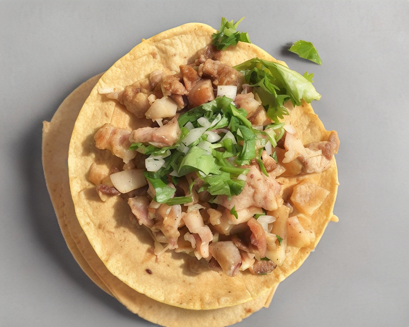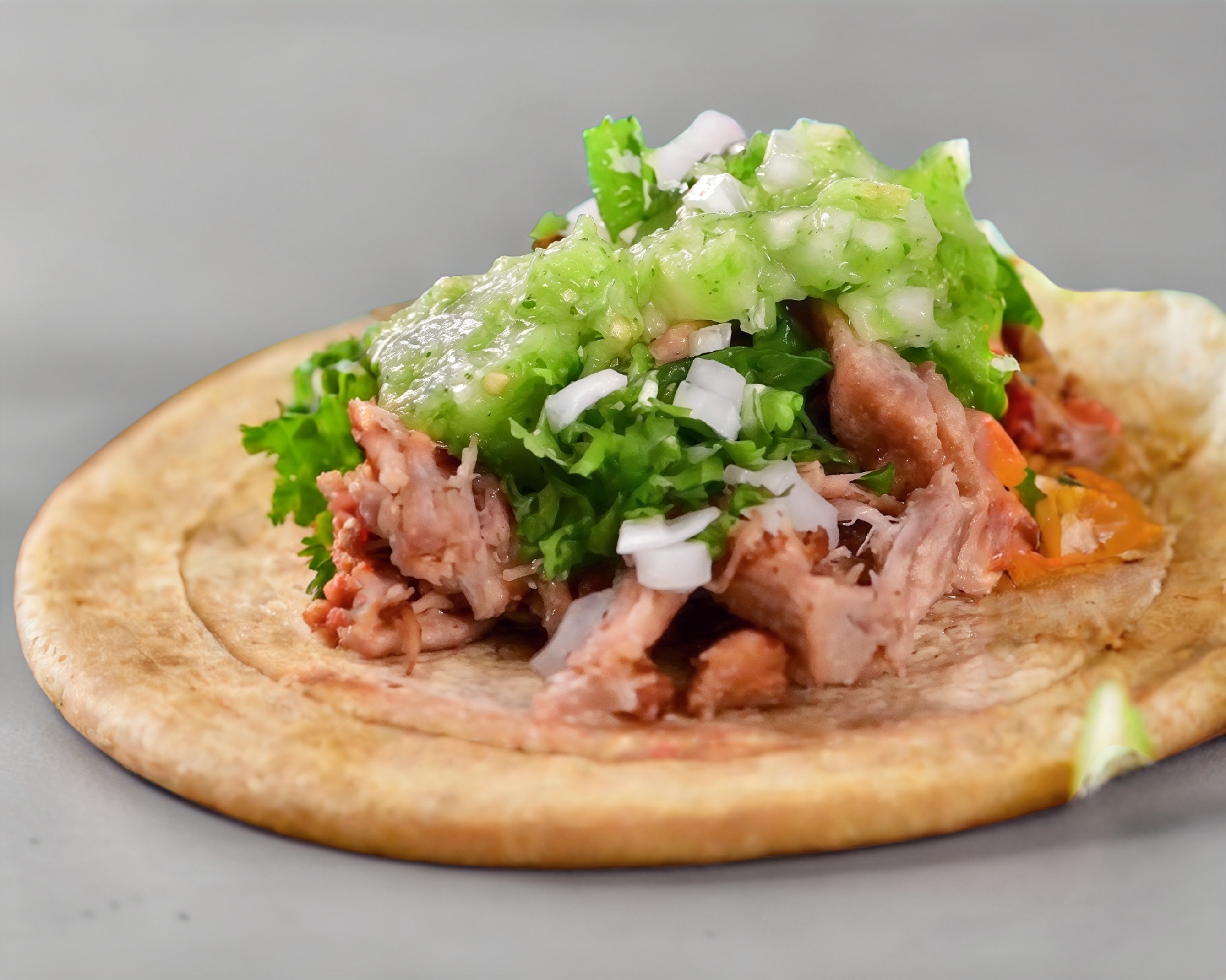 Taco en tortilla de maíz con nuestro exquisito chicharron de Cáscara o Ranchero limón, salsa .