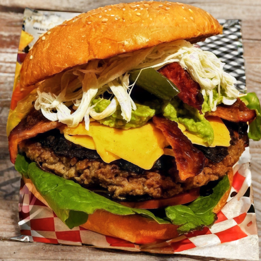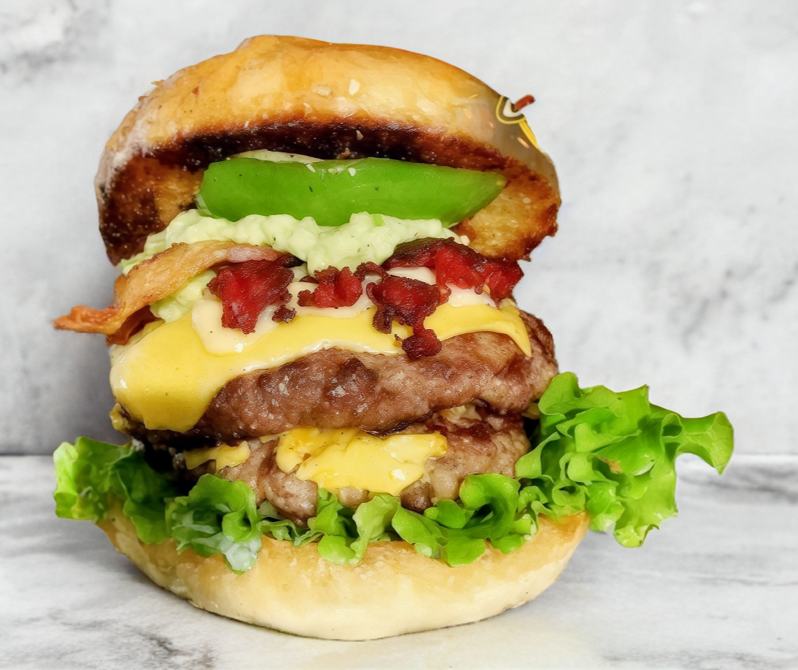 Pan, mayonesa, lechuga, tomate, cebolla, 2 carnes, queso americano, queso manchego, chorizo, tocino, guacamole y chile toreado con papas.(Hamburguesas en promoción NO Incluye Papas)