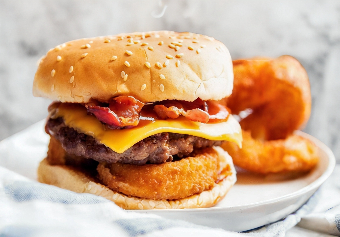 Pan,mayonesa,carne,queso Americano 2 Aros de cebolla, tocino y salsa BBQ con papas