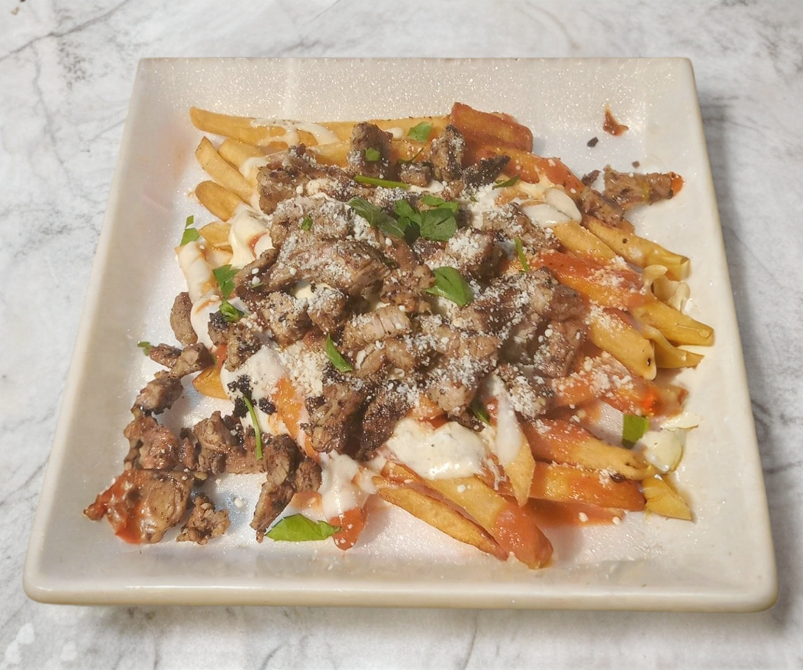 300 gr de papas, puré de tomate, carne arrachera y queso hebra.