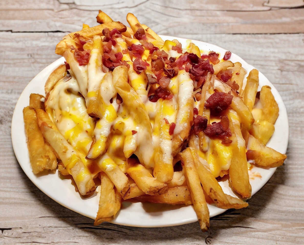 Aprox. 300gr de papas ala francesa, 3 quesos mixto , queso líquido y tocino picado