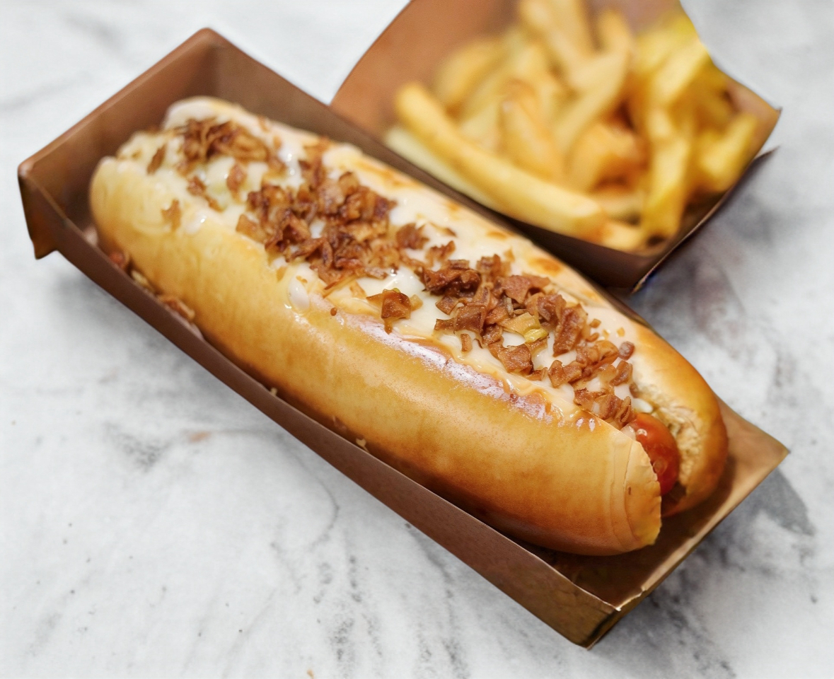 Pan, mayonesa, salchicha, cebolla asada, tocino, chorizo y queso líquido.