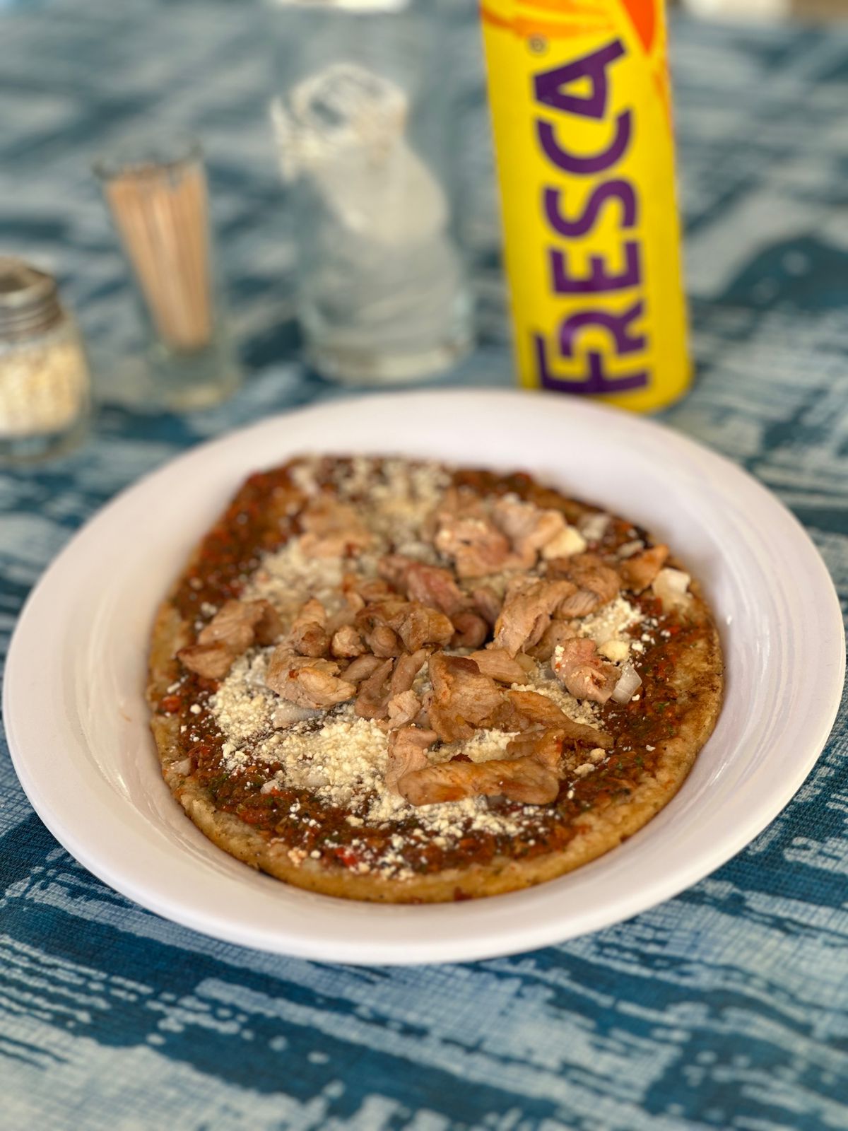 Tortilla hecha a mano con frijoles refritos, bañada en salsa roja y salsa verde, acompañada de cebolla, queso, longaniza y bistec de cerdo.