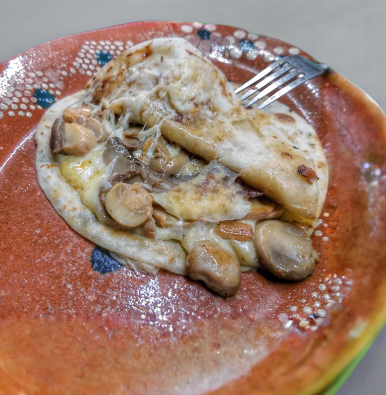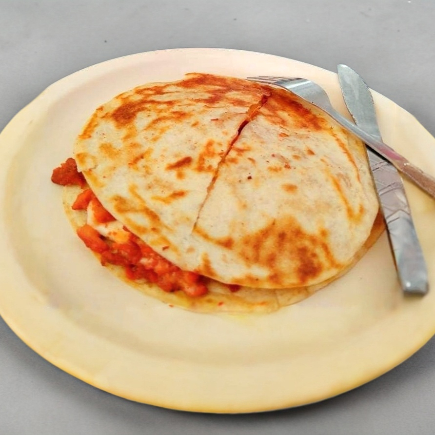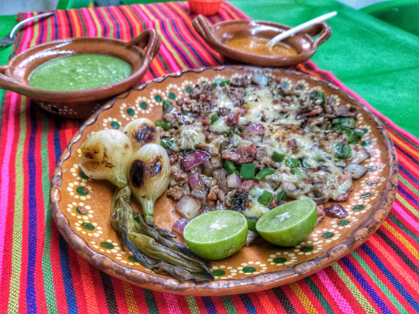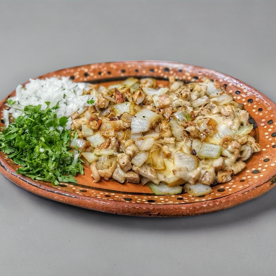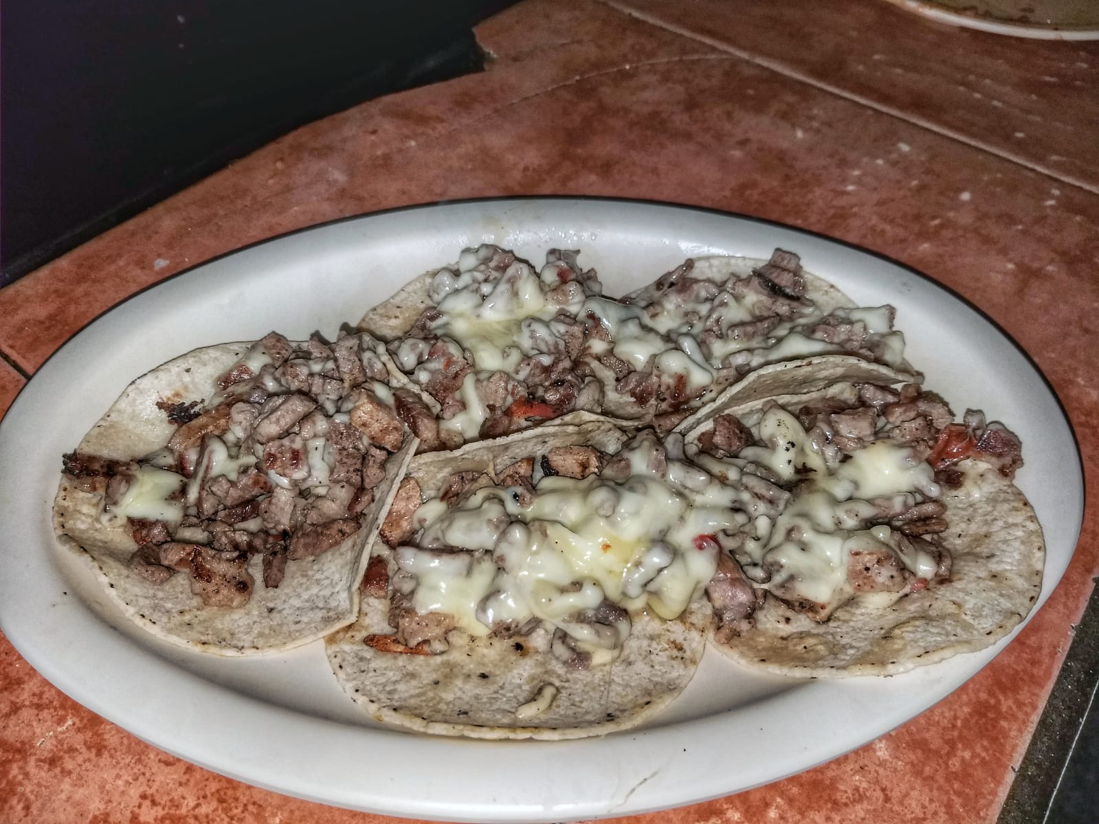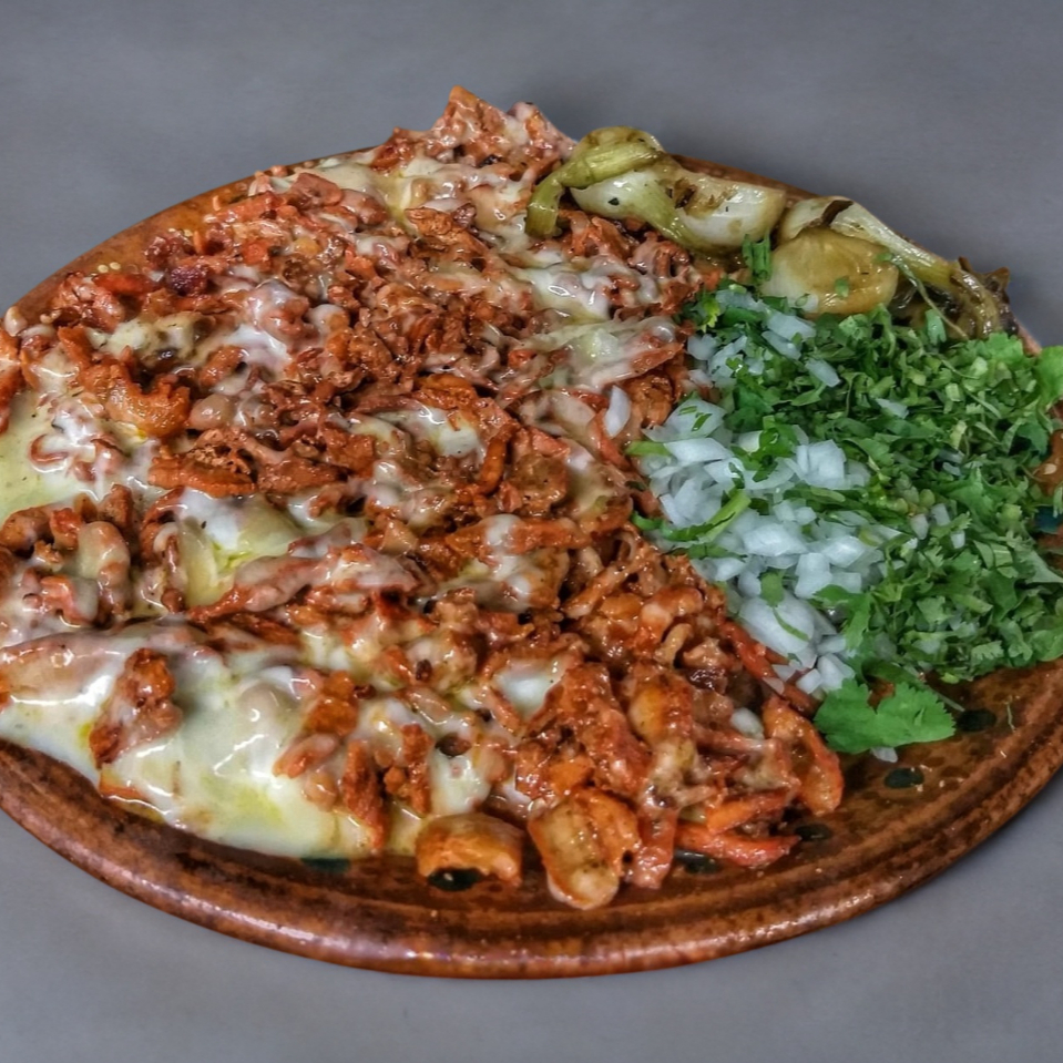 Pimiento morrón verde, cebolla,carne al pastor y queso