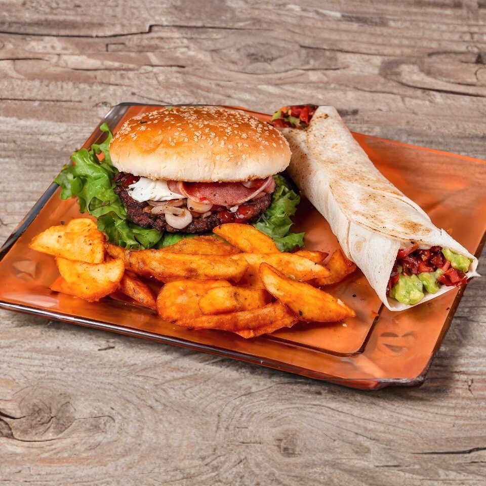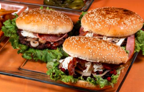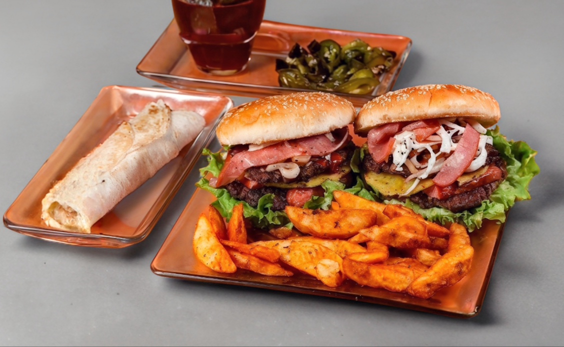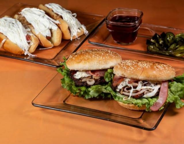 Carne casera, tomate, aros de cebolla, queso americano, queso manchego, Lechuga italiana, mayonesa y aderezo BBQ acompañada de una porción de papa