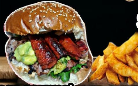 Hamburguesa de chistorra con Tocino y guacamole con papas