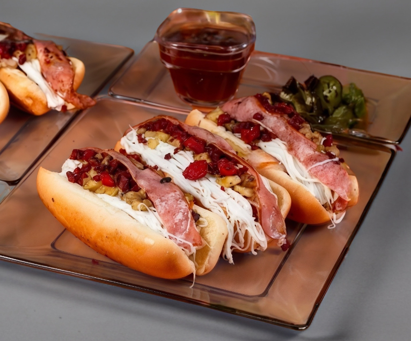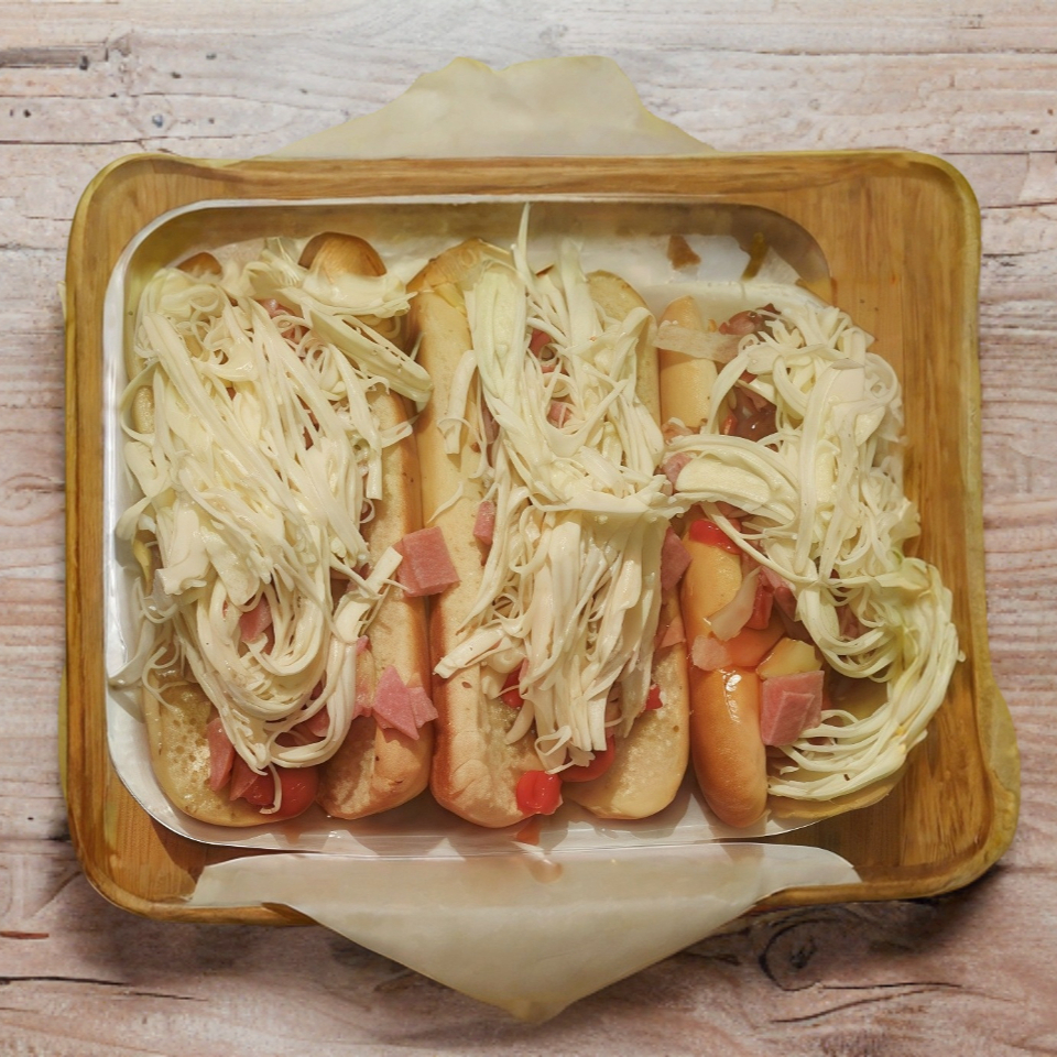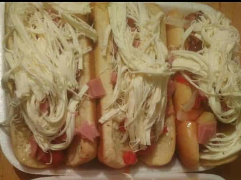Salchicha, queso de hebra, tomate, cebolla asada,catsup y mayonesa
