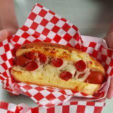 Hot dog, queso, tomate cebolla. rajas, mostaza