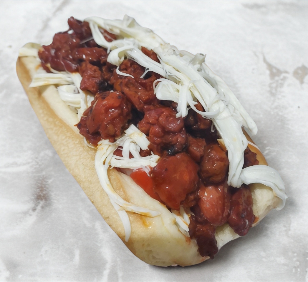 hotdog con salchicha, tomate, cebolla, queso de hebra, mayonesa, mostaza, catsup, queso amarillo y chiles en rajas.