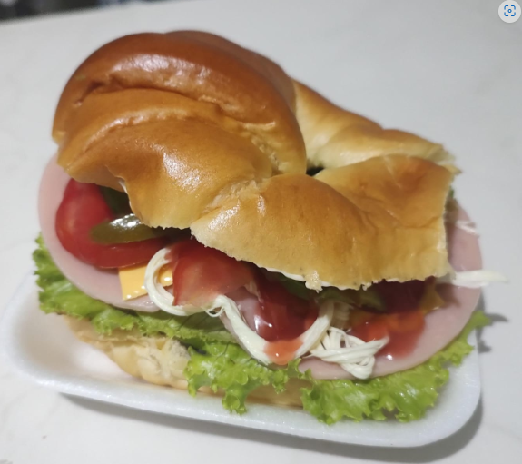 Orden de un delicioso cuernito de jamon, queso manchego, cama de lechuga, tomate, aguacate, mayonesa, mostaza, catsup.