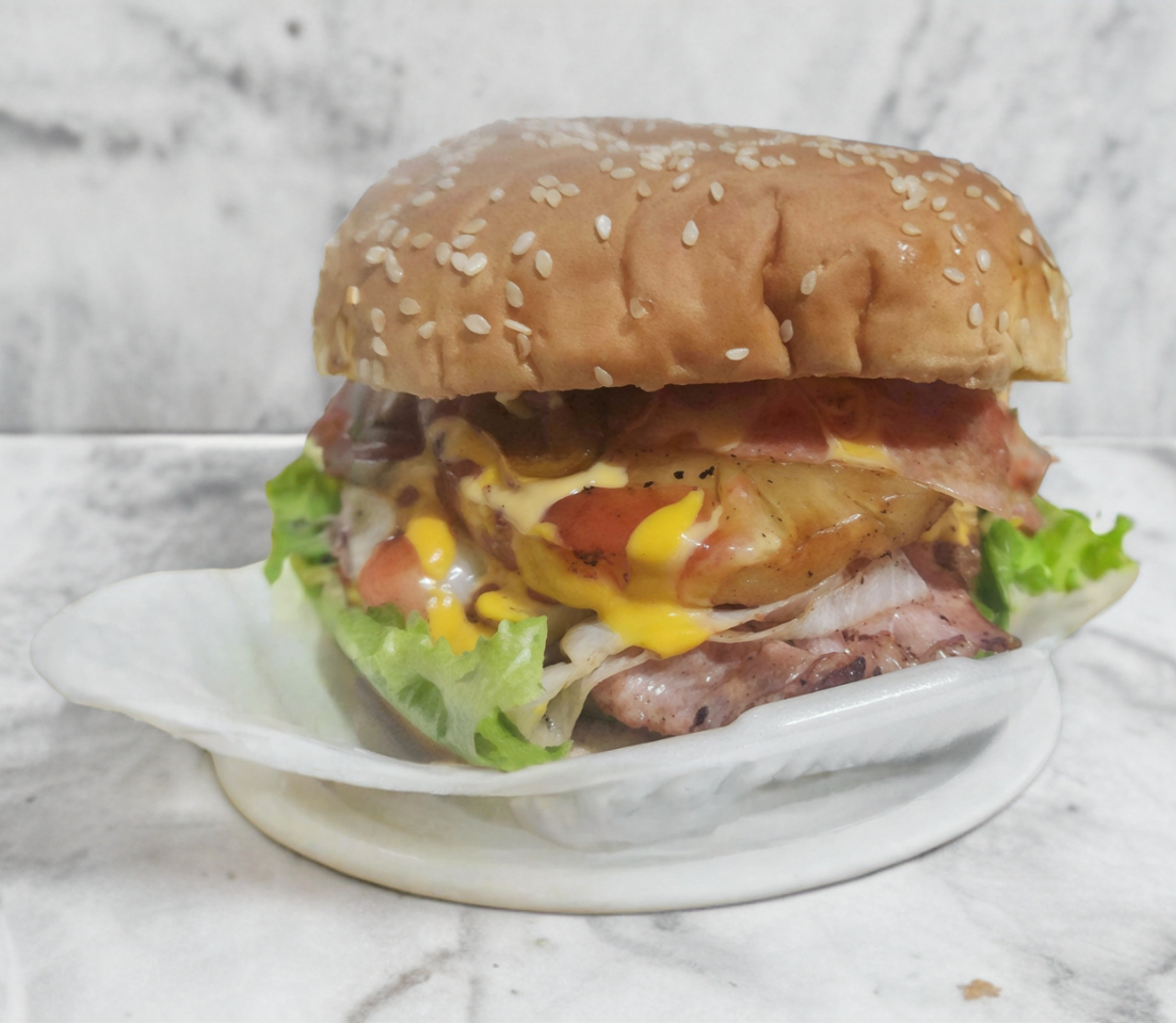 Hamburguesa con pan con ajonjoli, carne jugosita, queso amarillo, cama de lechuga, tiras de tocino, rebanada de piña asada, jamon, cebolla asada, mayonesa, mostaza, catsup y chiles en rajas