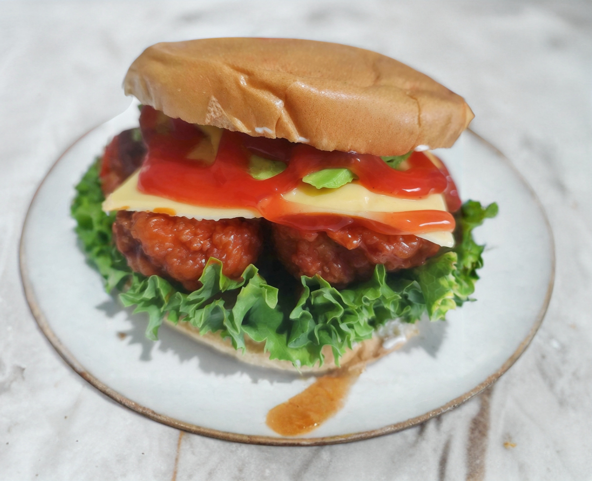 Hamburguesa con pan de ajonjoli, cama de lechuga, boneless con el aderezo de tu eleccion (bbq, bufalo, mostaza miel, mango habanero, valentina) queso amarillo, tomate, ranch, mayonesa, catsup