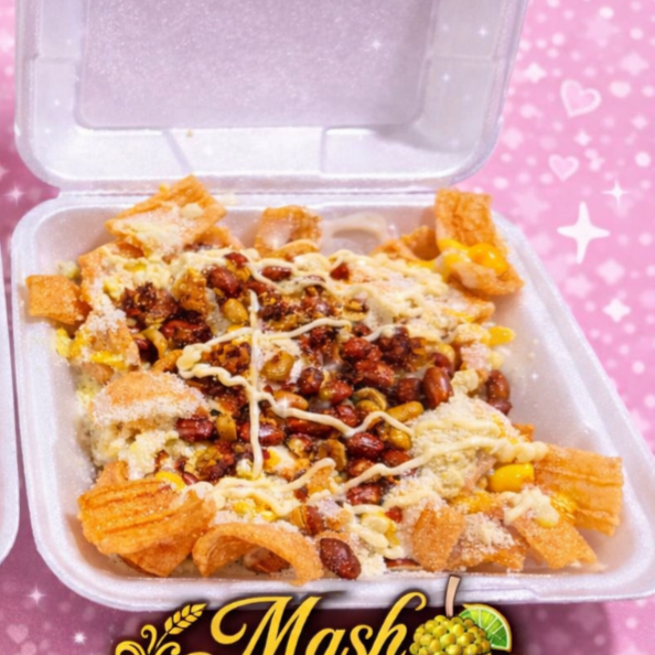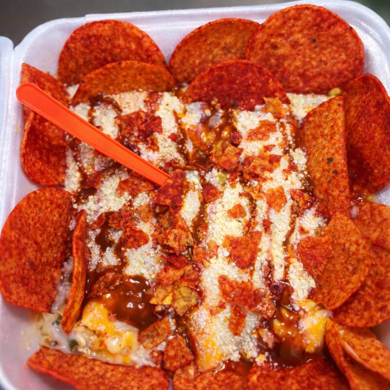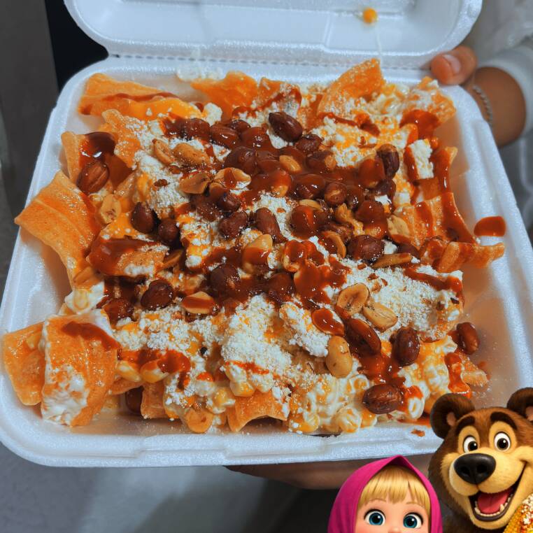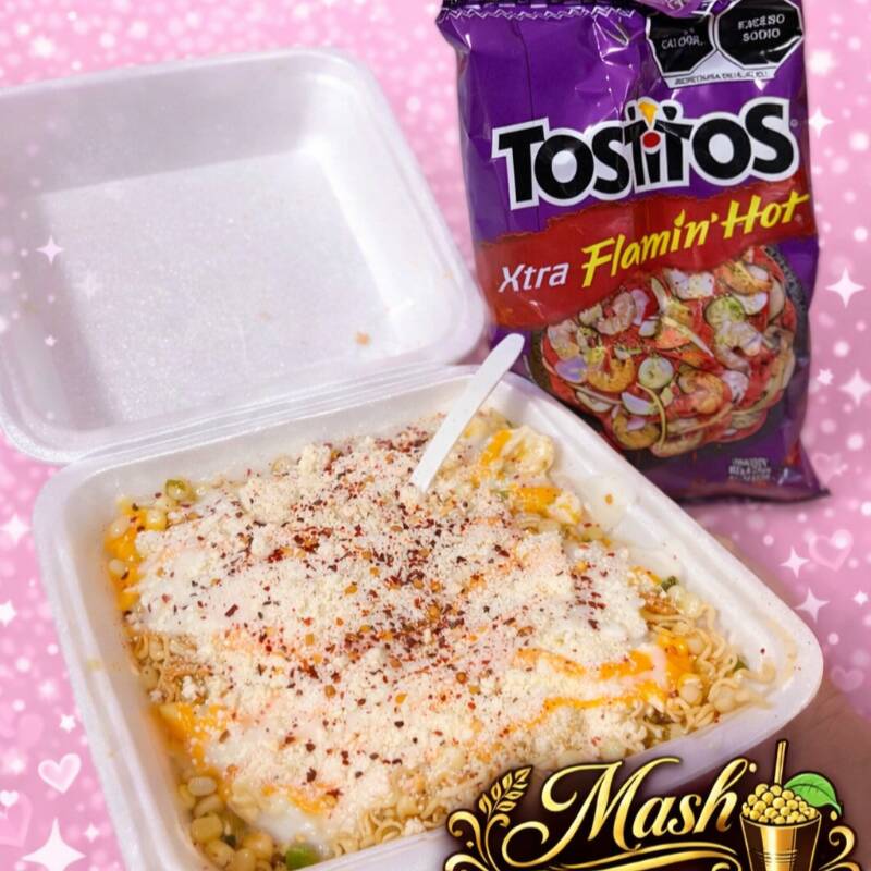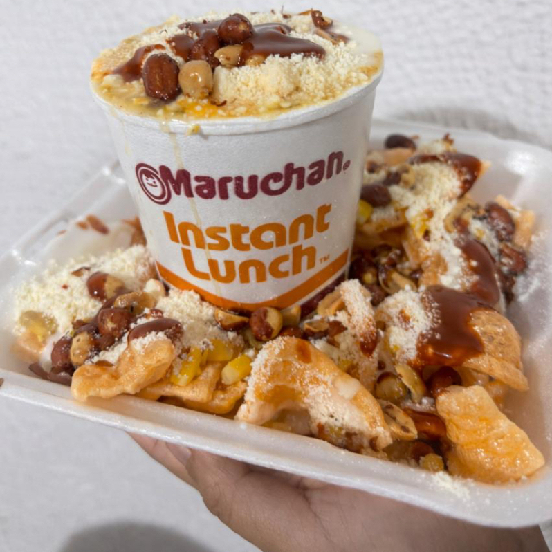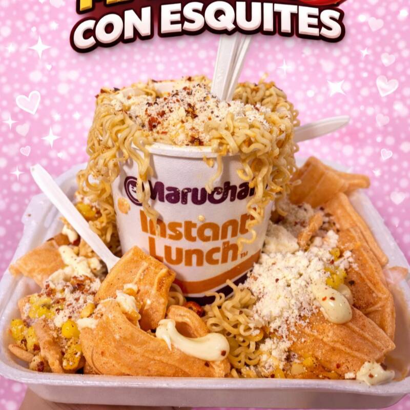 Maruchan preparada con esquites, Tostitos crujientes, queso amarillo, mayonesa, limón, salsa y chile en polvo.