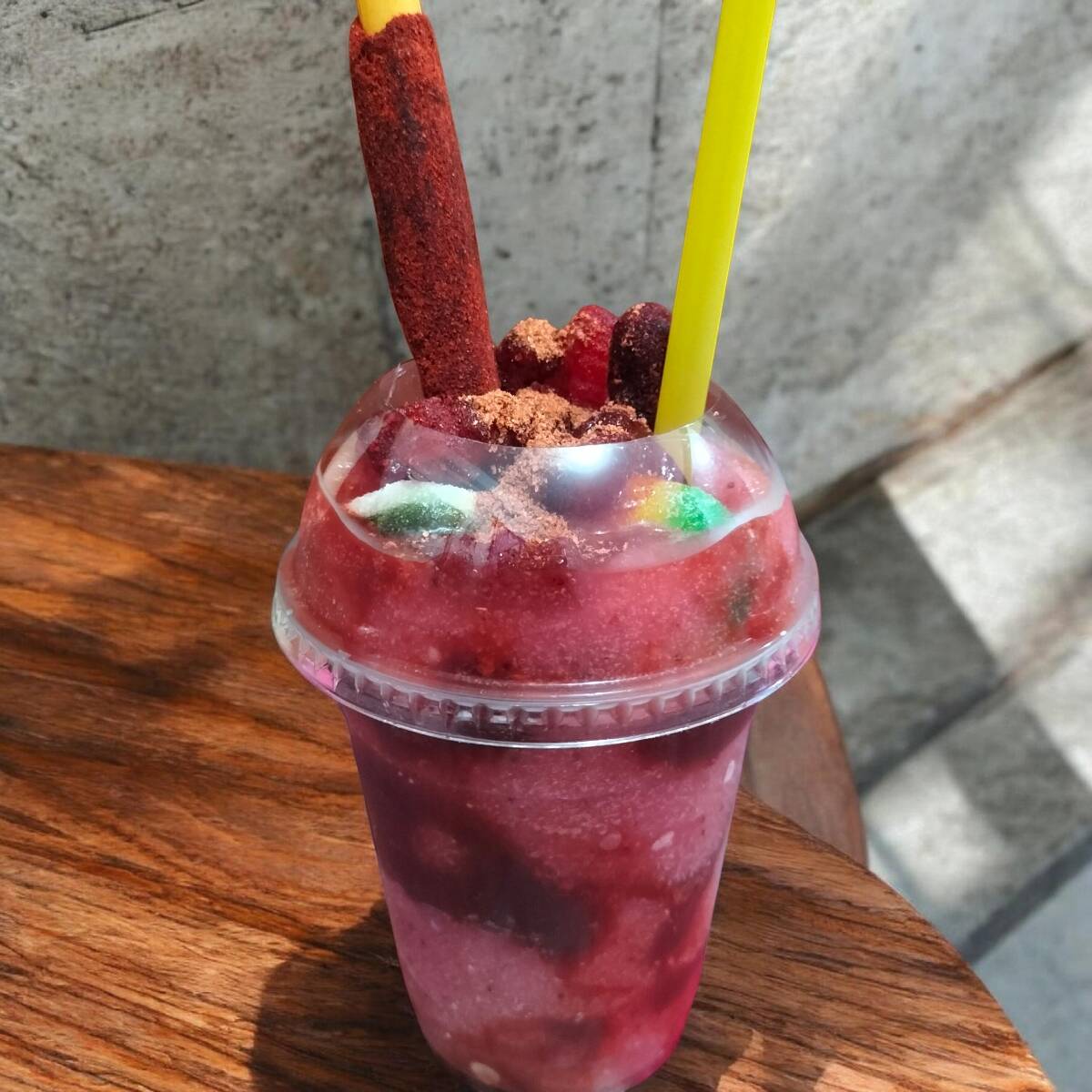 Frappé de fresa con chamoy, chilito, gomitas y barilla de tamarindo