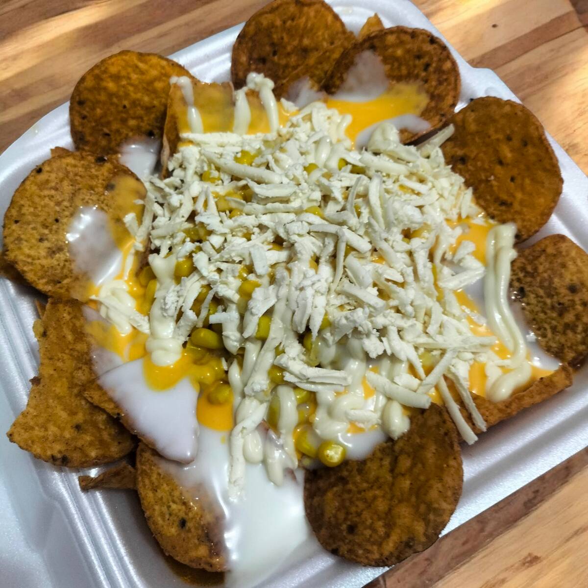 Tostitos + 2 Maruchan + granos de elote (Granos de elote, mayonesa, queso amarillo, crema, queso blanco)