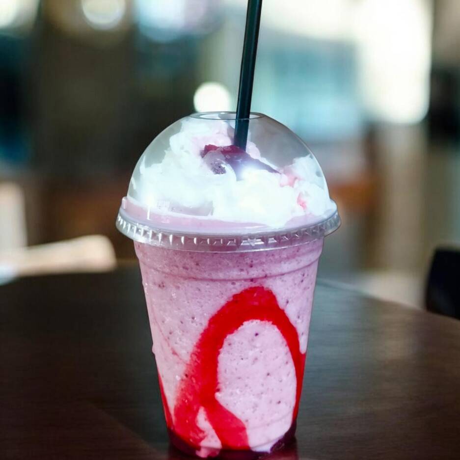Frappé de fresas decorado con jarabe de fresa, crema batida y granillo de fresa.