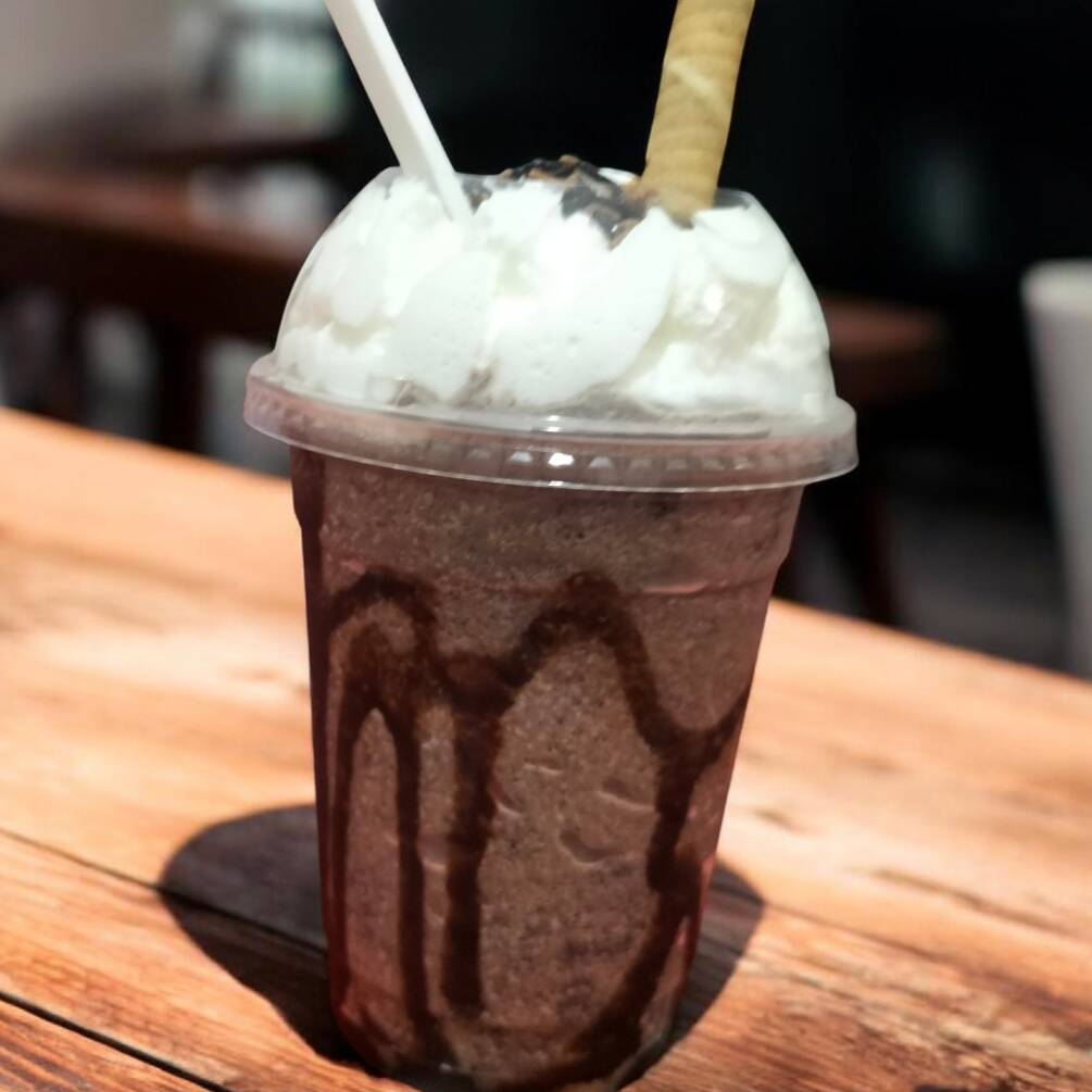 Frappé de chocolate decorado con jarabe de chocolate, crema batida y granillo de chocolate.