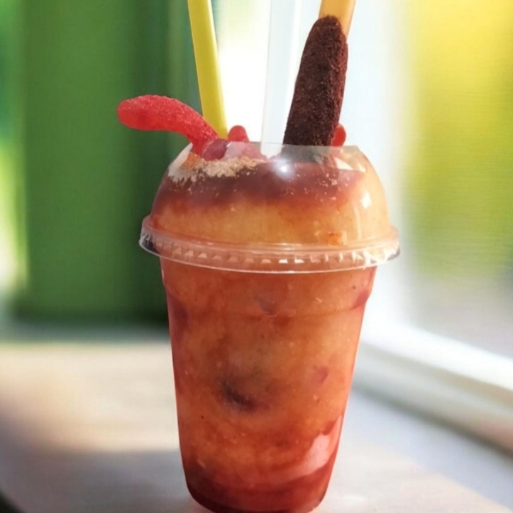 Frappé de mango con chamoy, gomitas enchiladas, banderilla de tamarindo.
