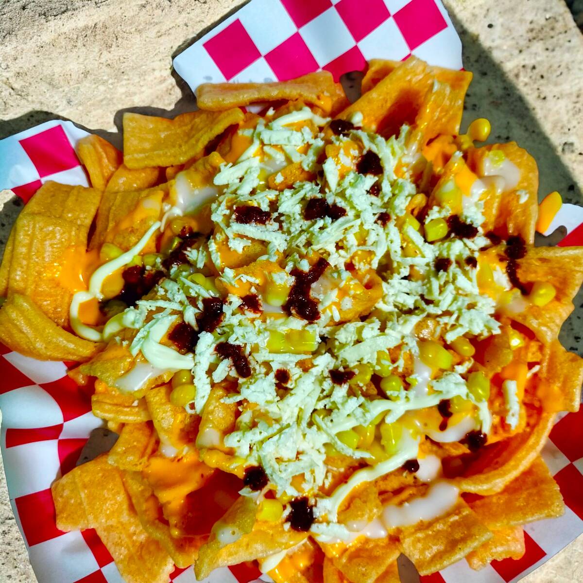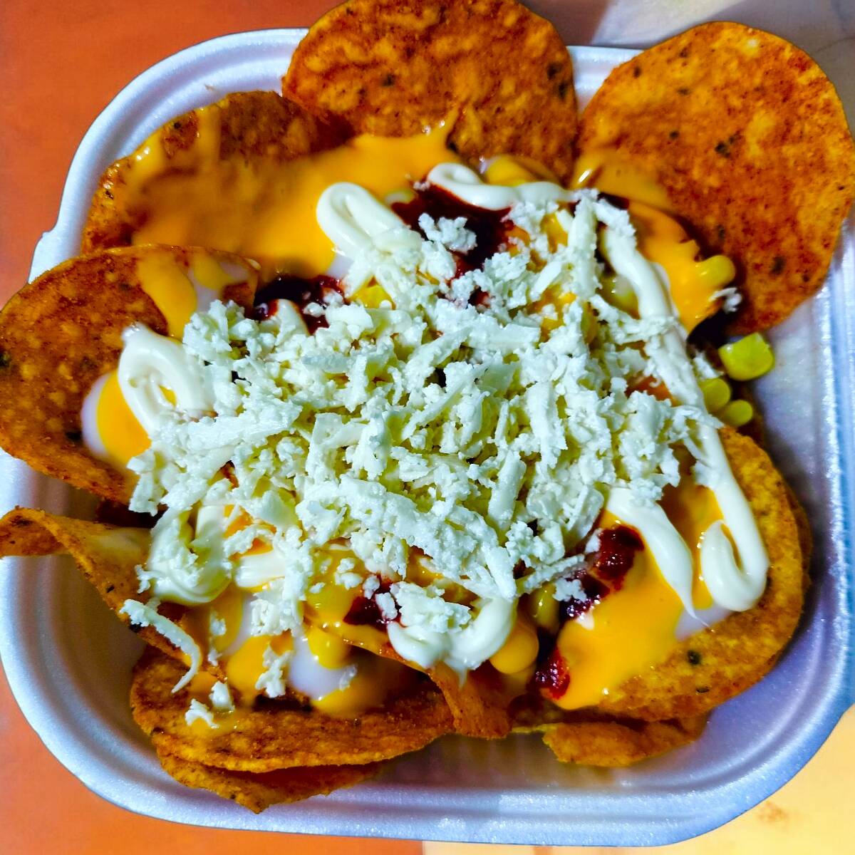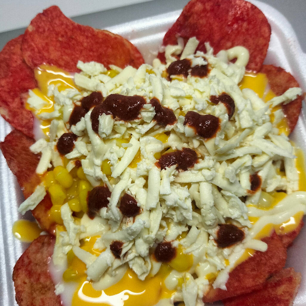 Tostitos flaming hot con granos de elote amarillo, crema, queso amarillo, mayonesa y queso blanco.