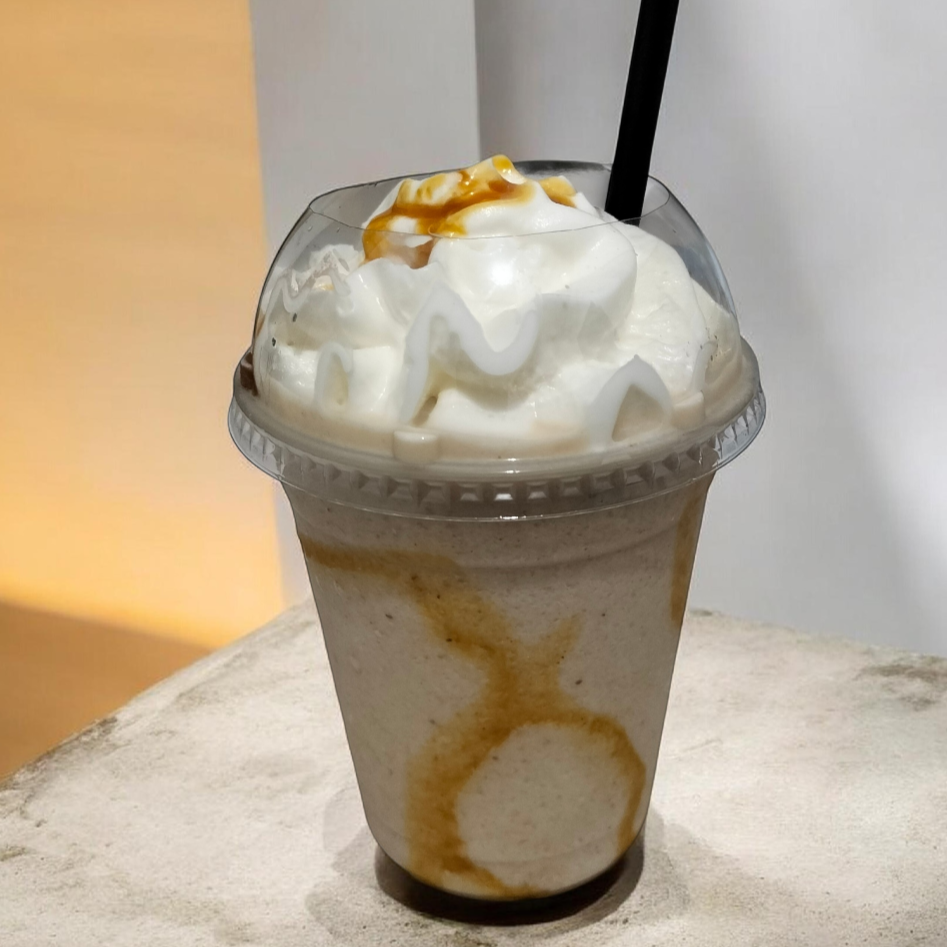 Frappé de café decorado con jarabe de caramelo, crema batida y granillo de capuchino y canela.