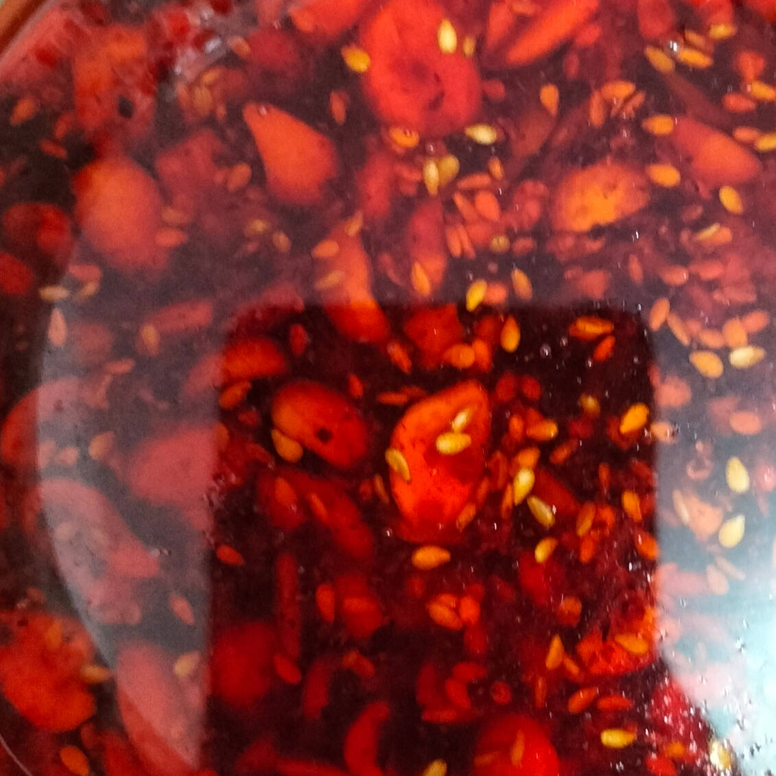 Salsa en aceite de cacahuate, semillas y ajonjoli con chile de árbol y ajo.
