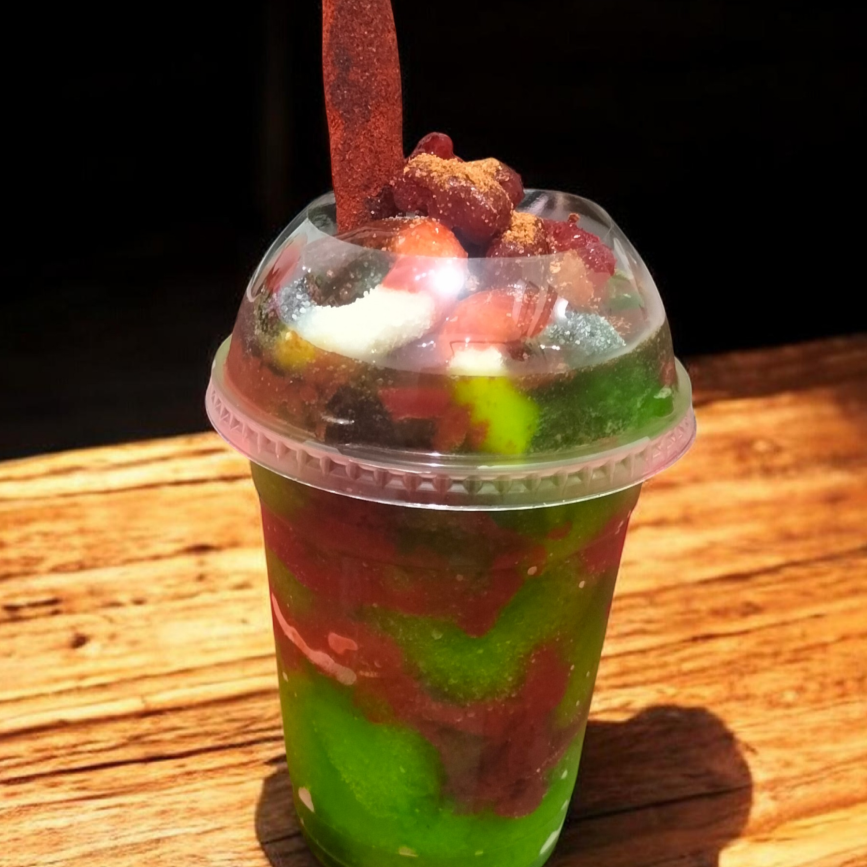 Frappe de fruta de mango con chamoy, chilito, gomitas y banderilla de tamarindo