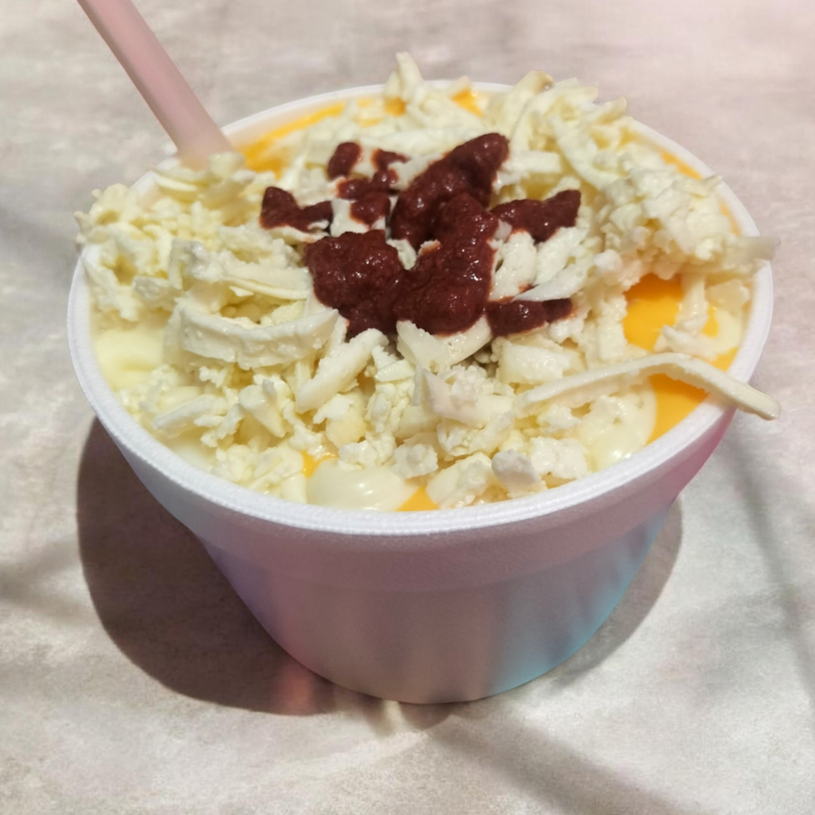 Sopa maruchan camarón habanero con granos de elote, crema, queso amarillo, mayonesa y queso blanco.