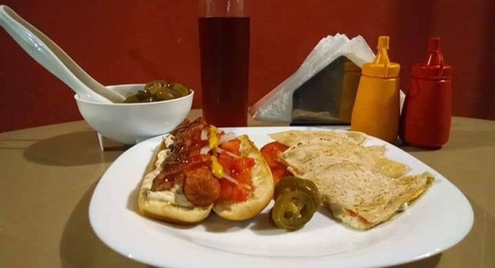 Hot-dog con tocino y queso oaxaca, jitomate, cebolla, chilitos curtidos, mayoneza, catsup y mostaza.