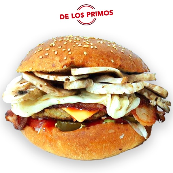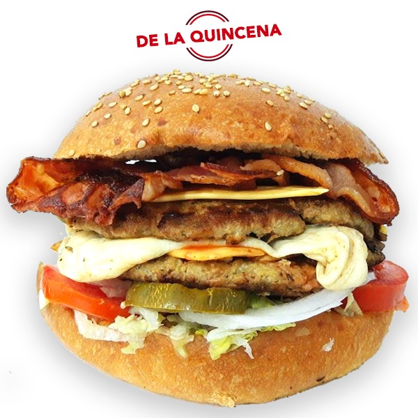 Hamburguesa con dos porcienes de 150g. de jugosa carne de res, acompañada de tocino, queso de hebra y queso tipo americano, sobre una cama de lechuga, jitimate, cebolla y chiles en escabeche, aderezados con mayoneza, catsup y mostaza.