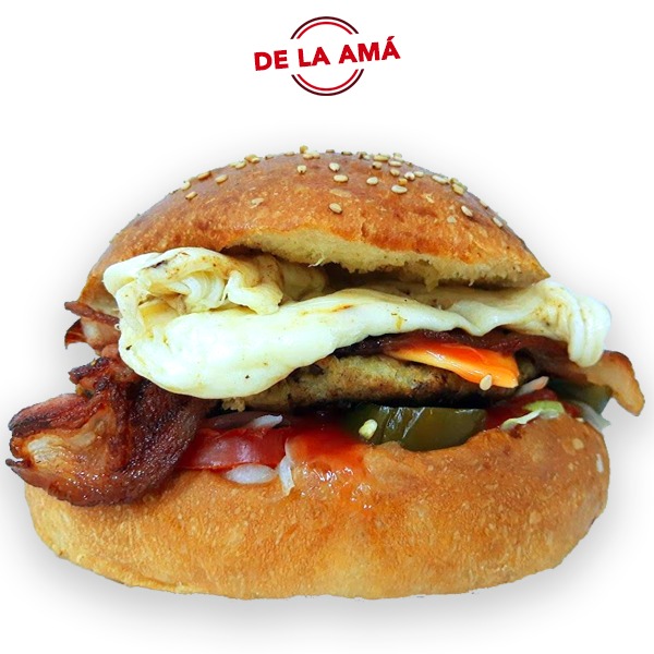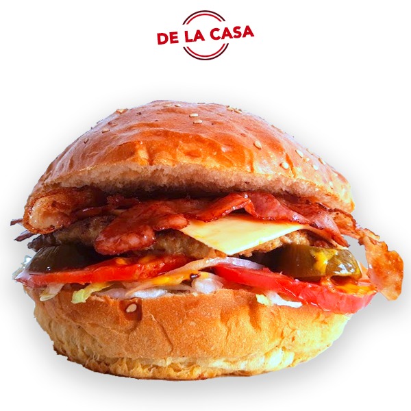 Hamburguesa con 150 gr de jugosa carne de res con tocino, queso tipo americano, sobre una cama de lechuga, jitomate, cebolla, y chiles en escabeche aderezados con mayonesa, catsup y mostaza. Todo dentro de nuestro delicioso pan casero.