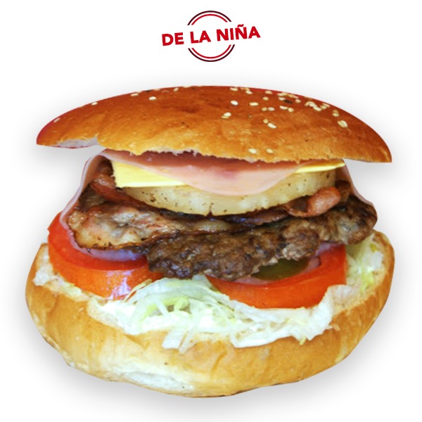 Hamburguesa con 150gr de carne de res con tocino, queso tipo americano, piña, sobre una base de lechuga, jitomate, cebolla, y chiles en escabeche aderezados con mayonesa, catsup y mostaza.