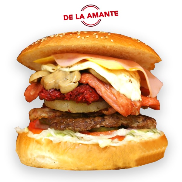 Hamburguesa de 150gr de jugosa carne de res con un poco de todos los ingredientes (piña, salchicha, chorizo, queso de hebra, champiñones, queso manchego) sobre una base de lechuga, jitomate, cebolla, con mayonesa, catsup y mostaza.