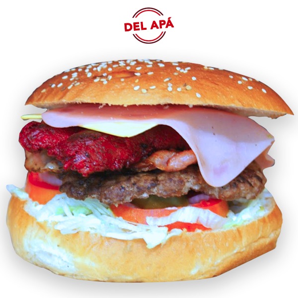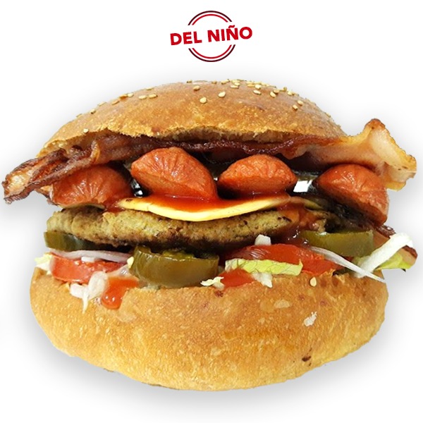 Hamburguesa con 150 gr de carne de res, tocino, queso tipo americano, salchicha, sobre una base de lechuga, jitomate, cebolla, aderezado con mayonesa, catsup y mostaza.