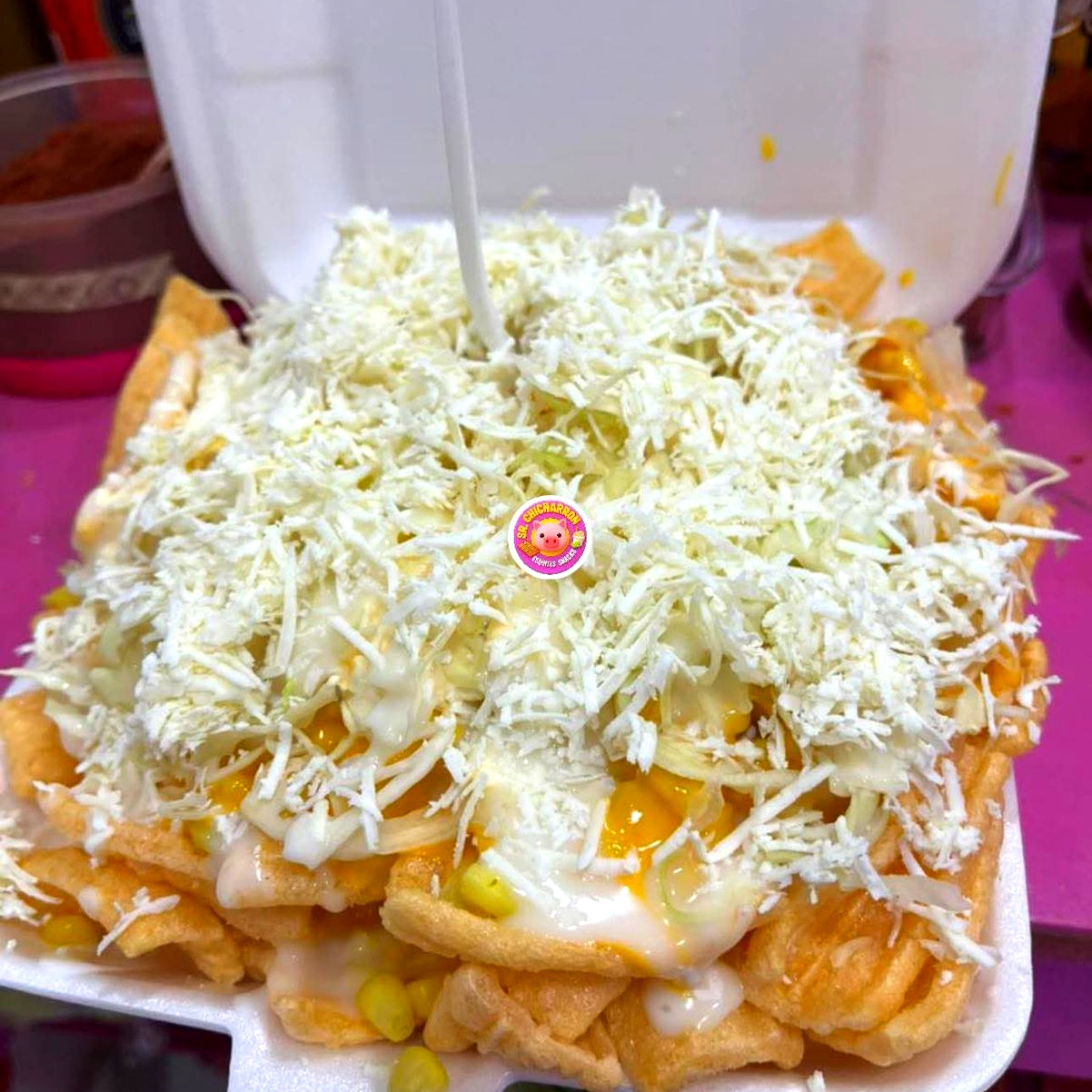 Chicharrón de cuadro con grano amarillo y varios quesos y verduras.