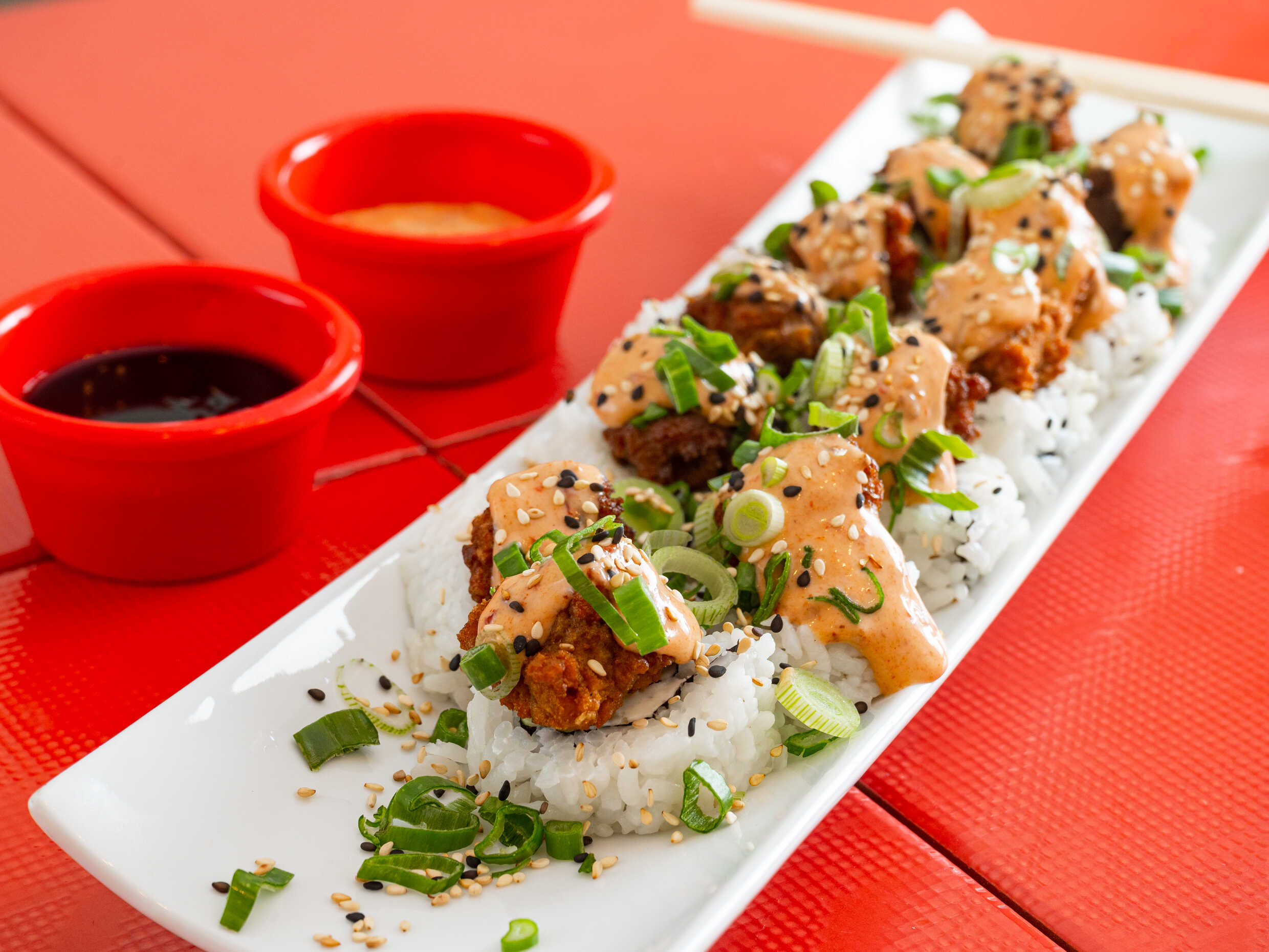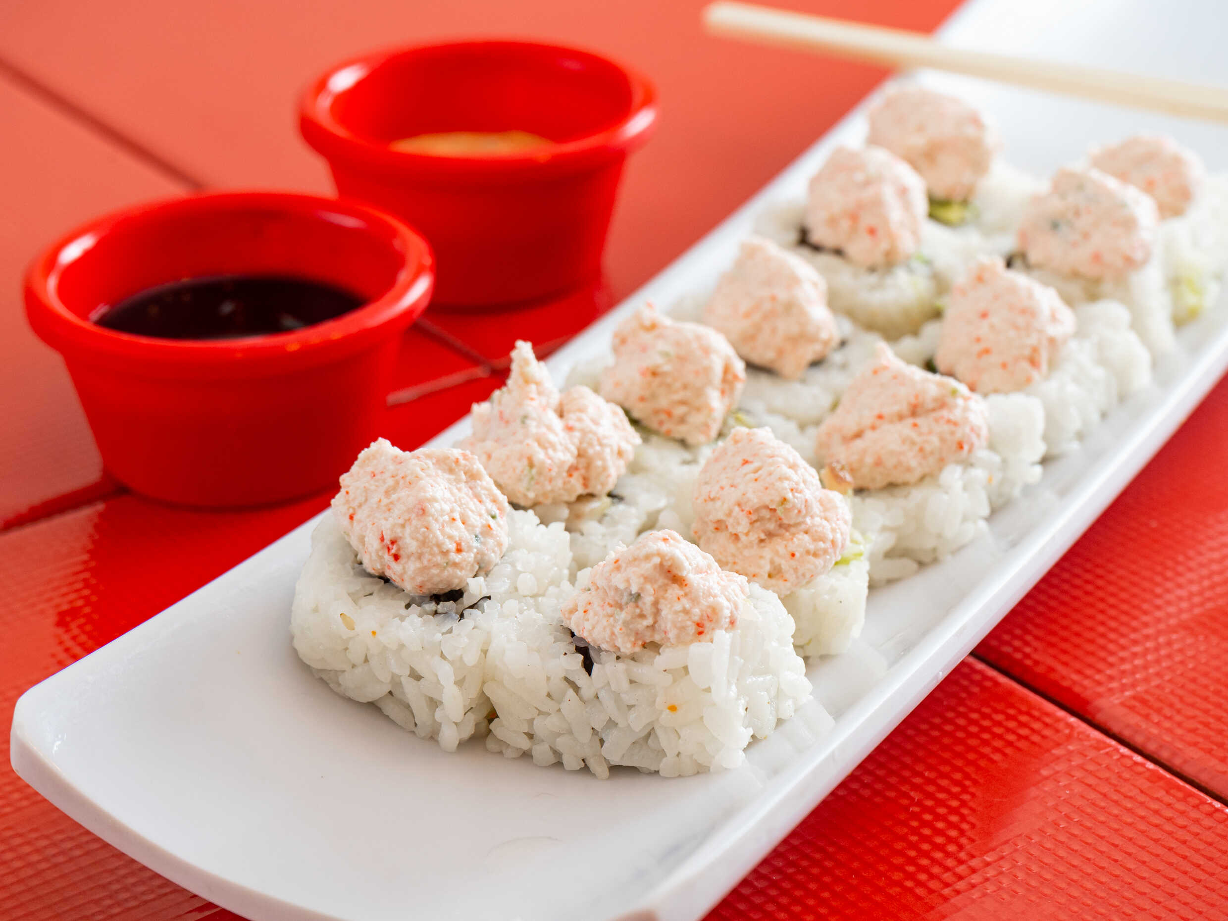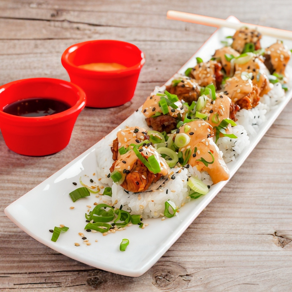 DENTRO: ATUN PICANTE, SRIRASHA Y QUESO PHILADELPHIA FUERA: ADEREZO DE CHIPOTLE Y CHIILE EN POLVO