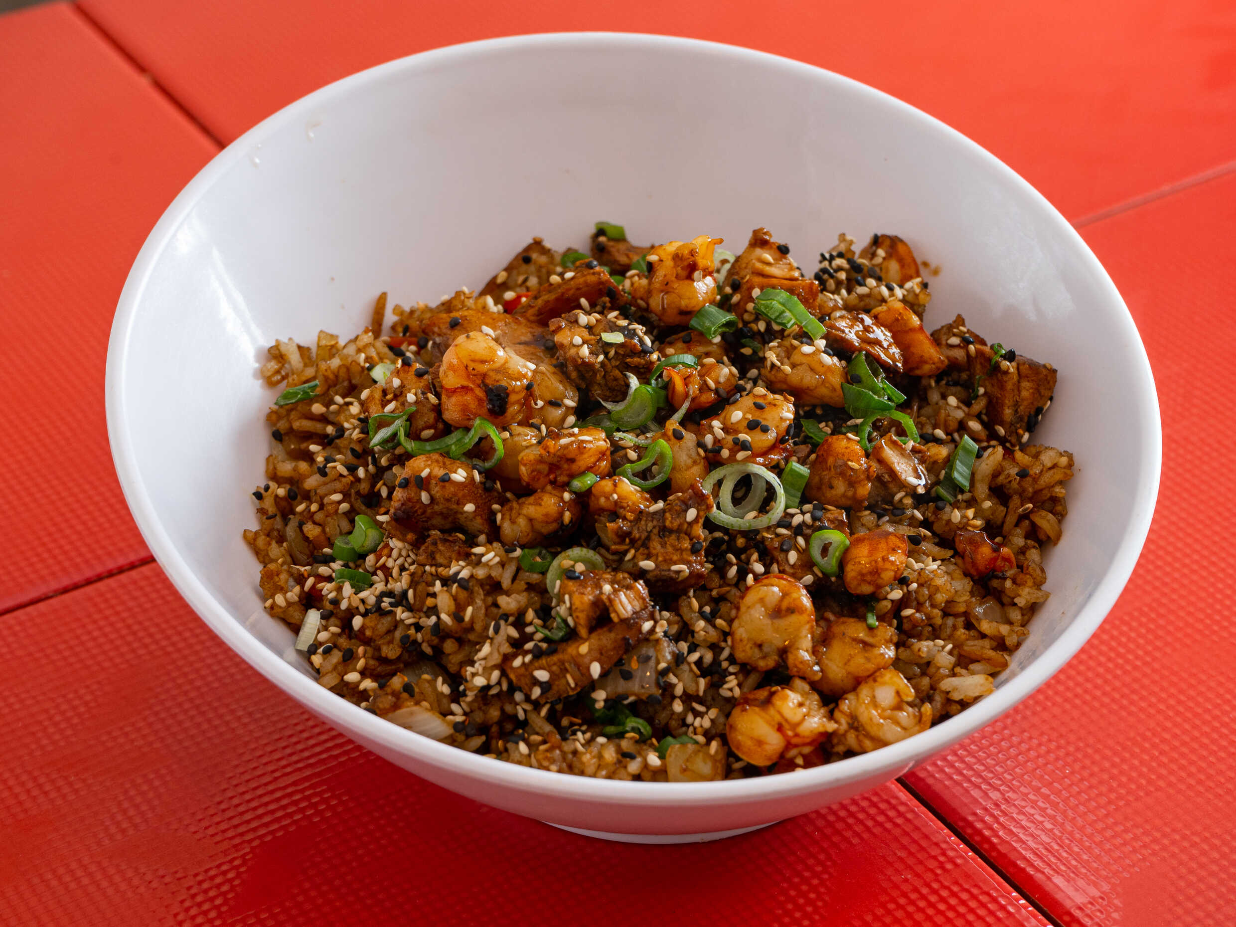 Arroz frito en soya con verduras, carne, pechuga de pollo