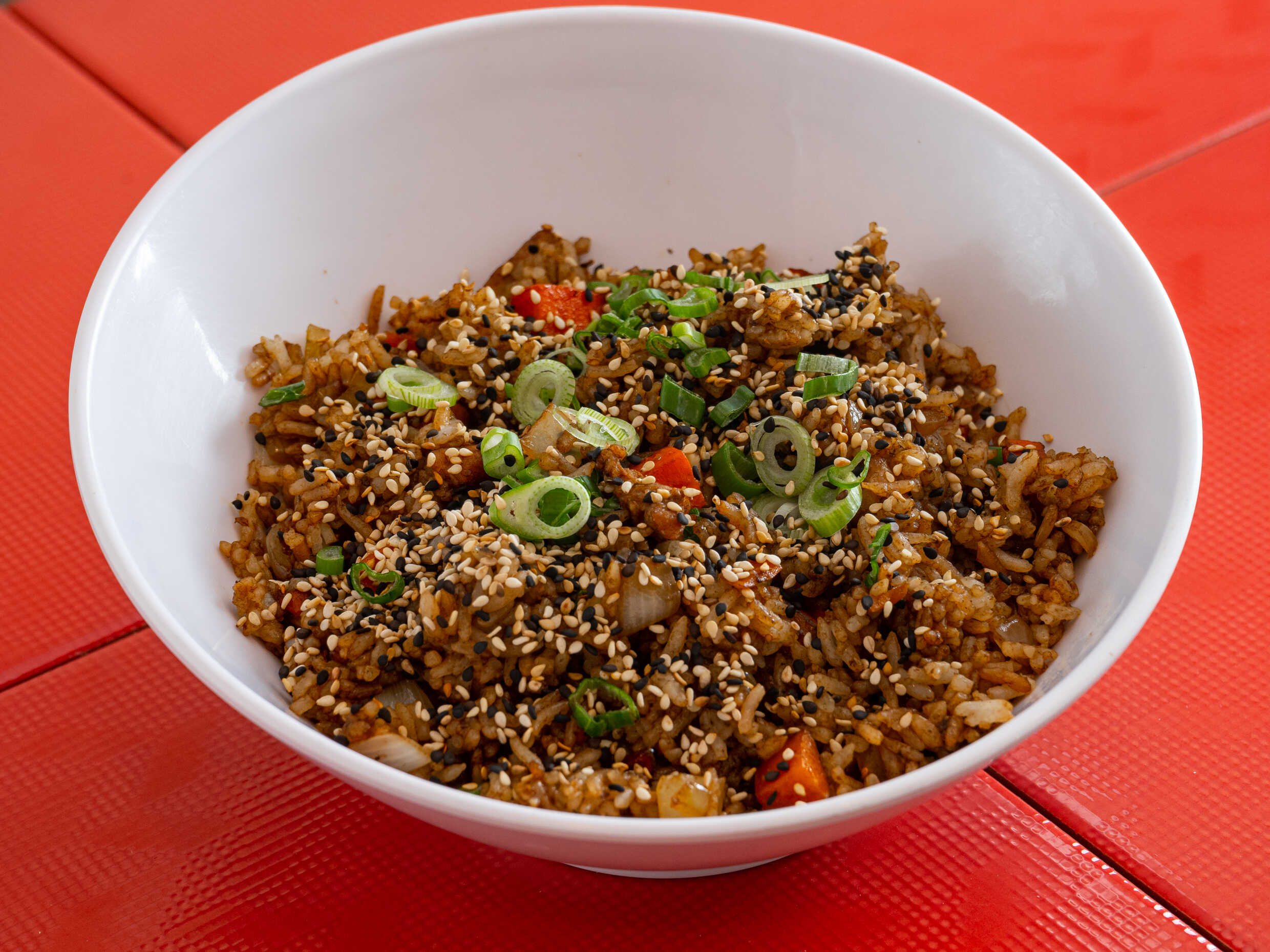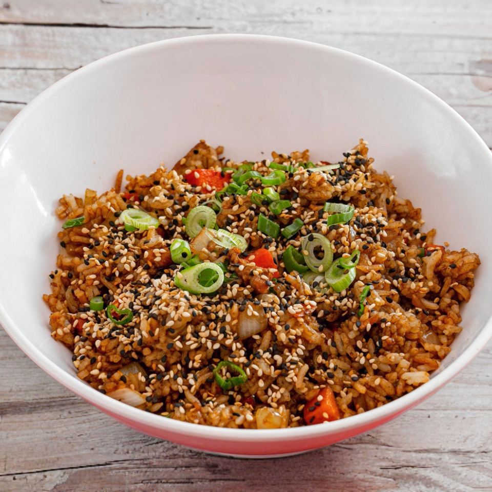 Arroz frito en soya con verduras, carne