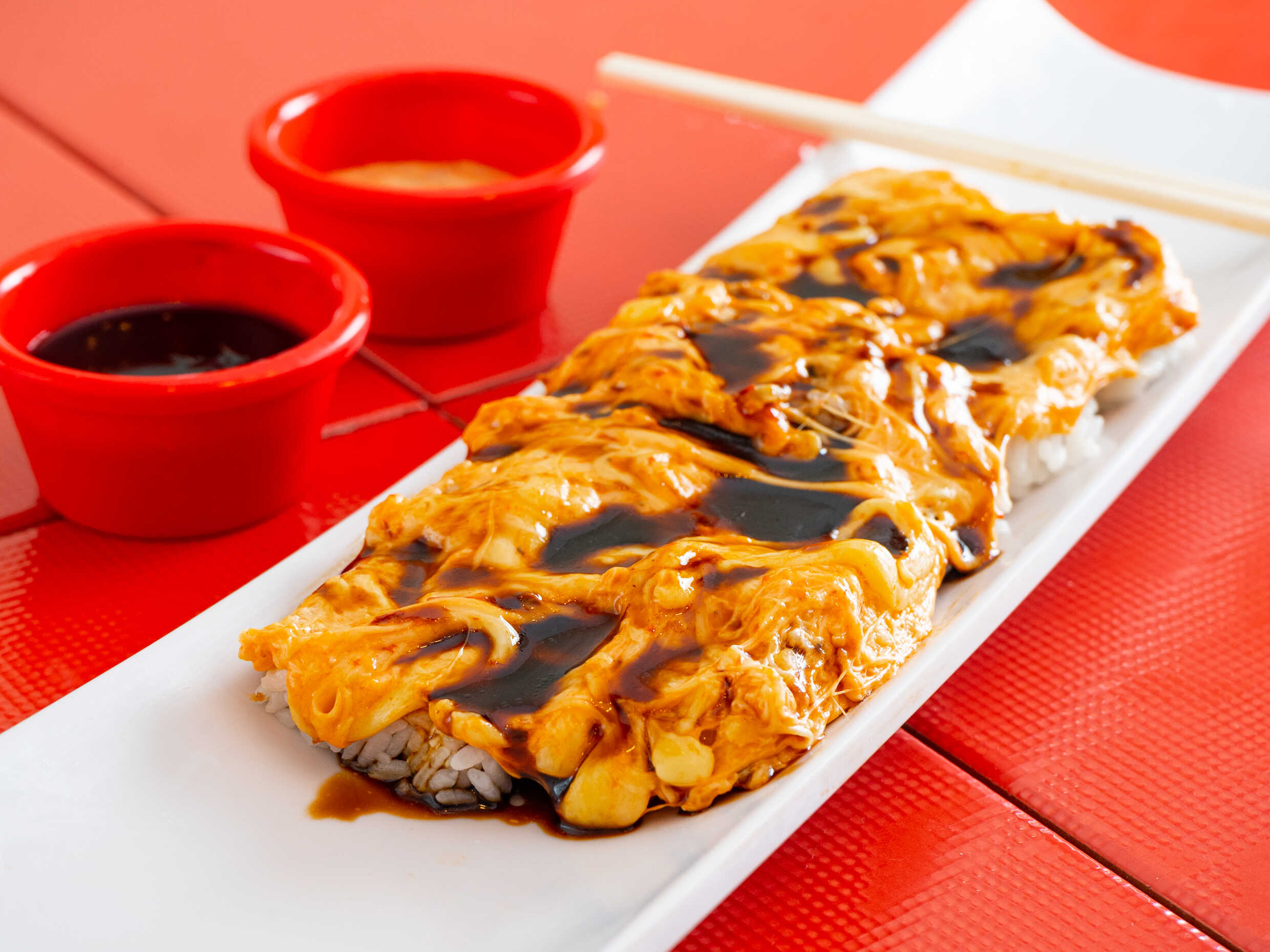DENTRO: PULPO, PHILADELPHIA Y SURIMI FUERA: ALGA NORI CAPEADA FRITO, SALSA DE ANGUILA Y AJONJOLI
