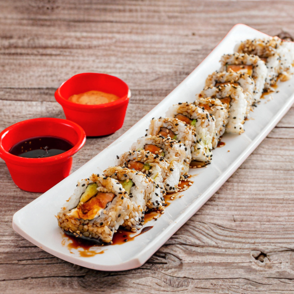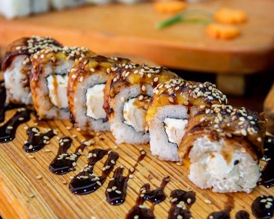 DENTRO: AGUACATE, SALMON Y PHILADELPHIA FUERA: ADEREZO DE CHIPOTLE, SALSA DE ANGUILA Y AJONJOLI