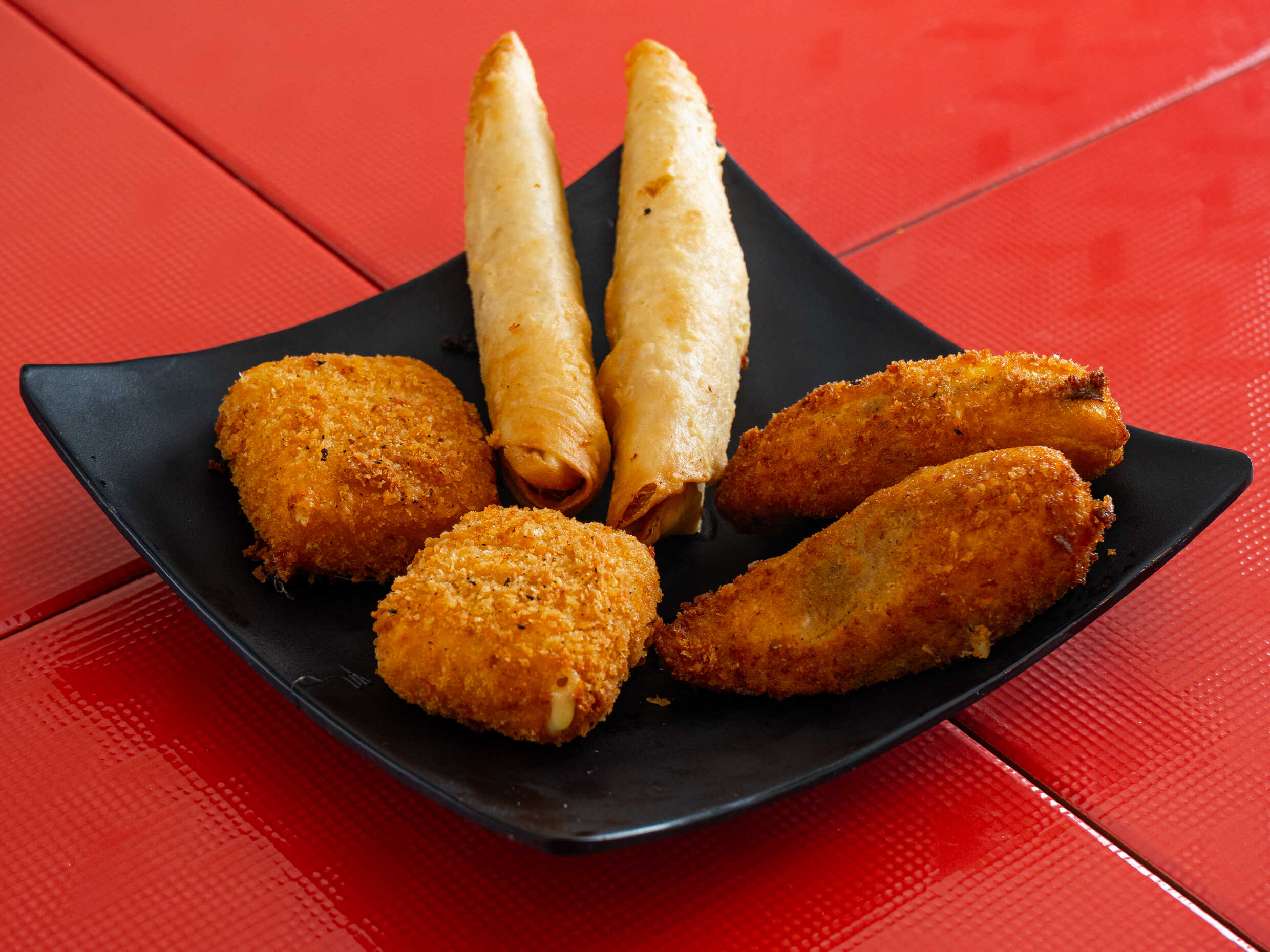 2 kushiagues de queso, 2 kushiagues de platano y 2 rollos primavera