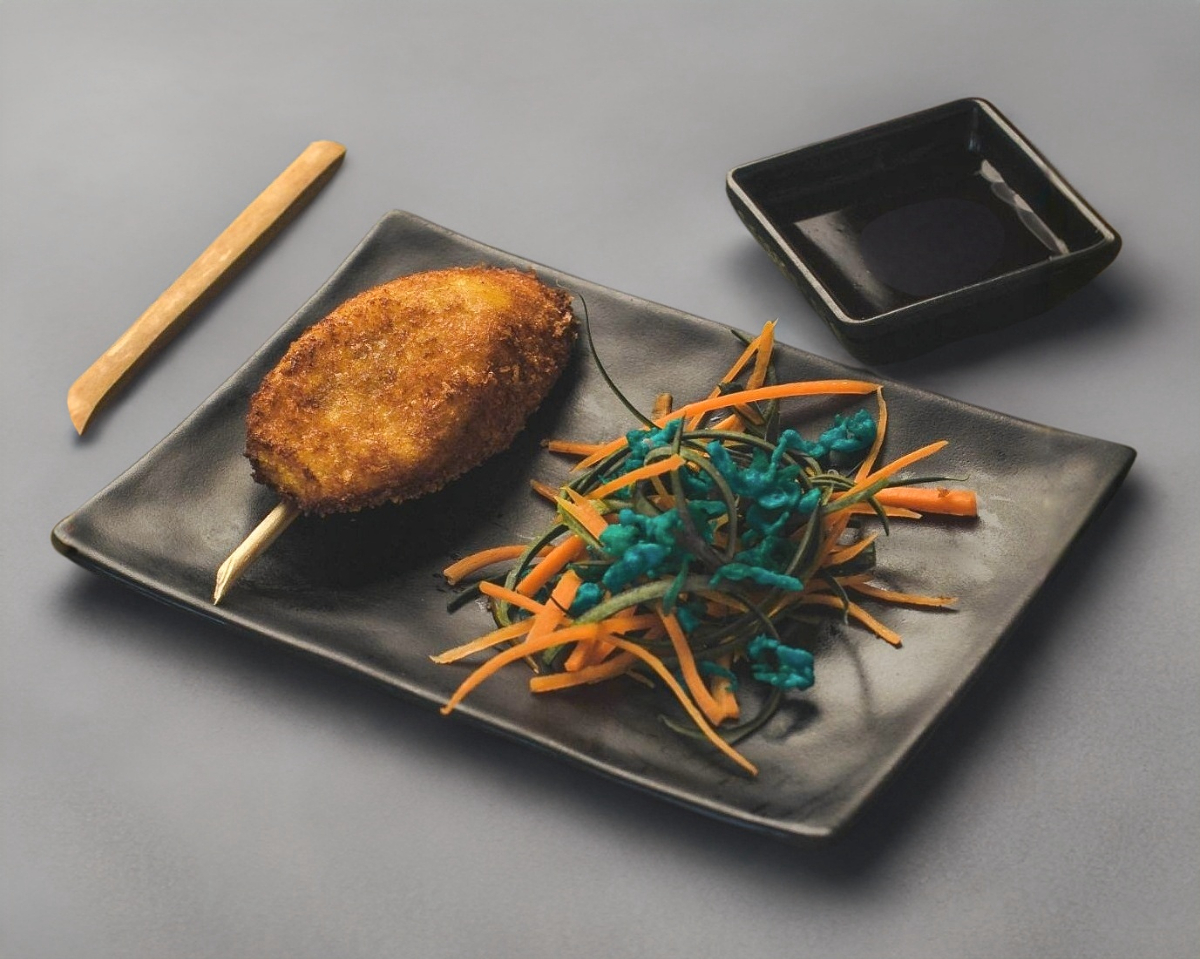 Dentro : queso Philadelphia tempura crujiente y surimi fuera : plátano macho frito