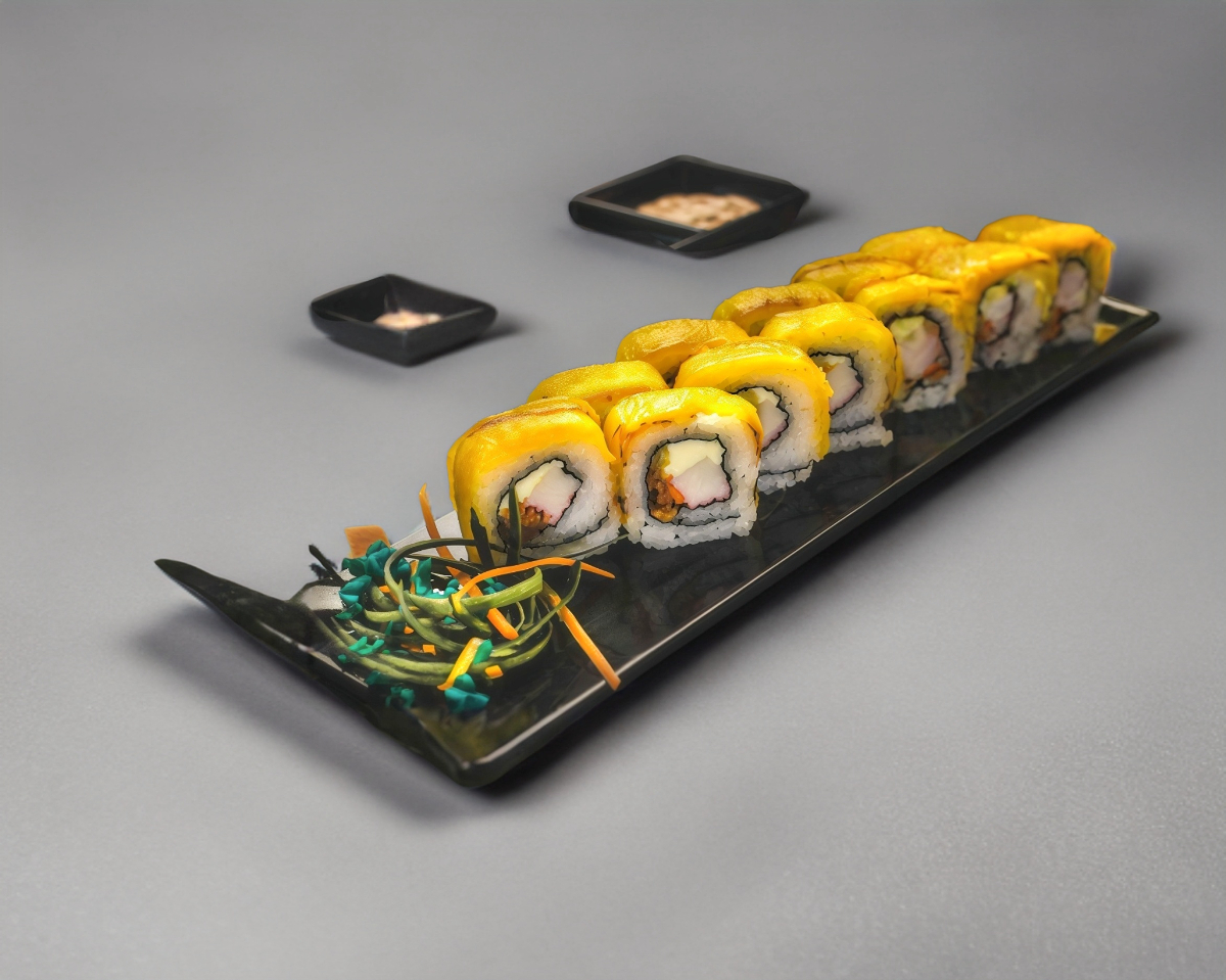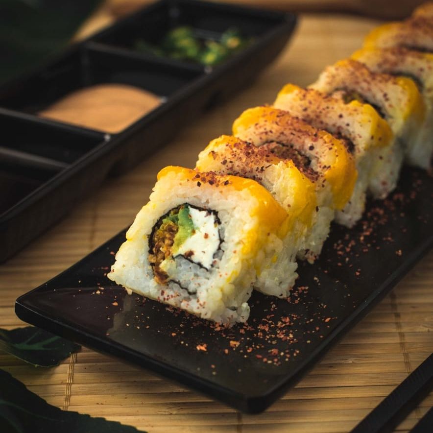 Dentro : queso Philadelphia tempura crujiente y aguacate fuera : laminas de mango y chile en polvo