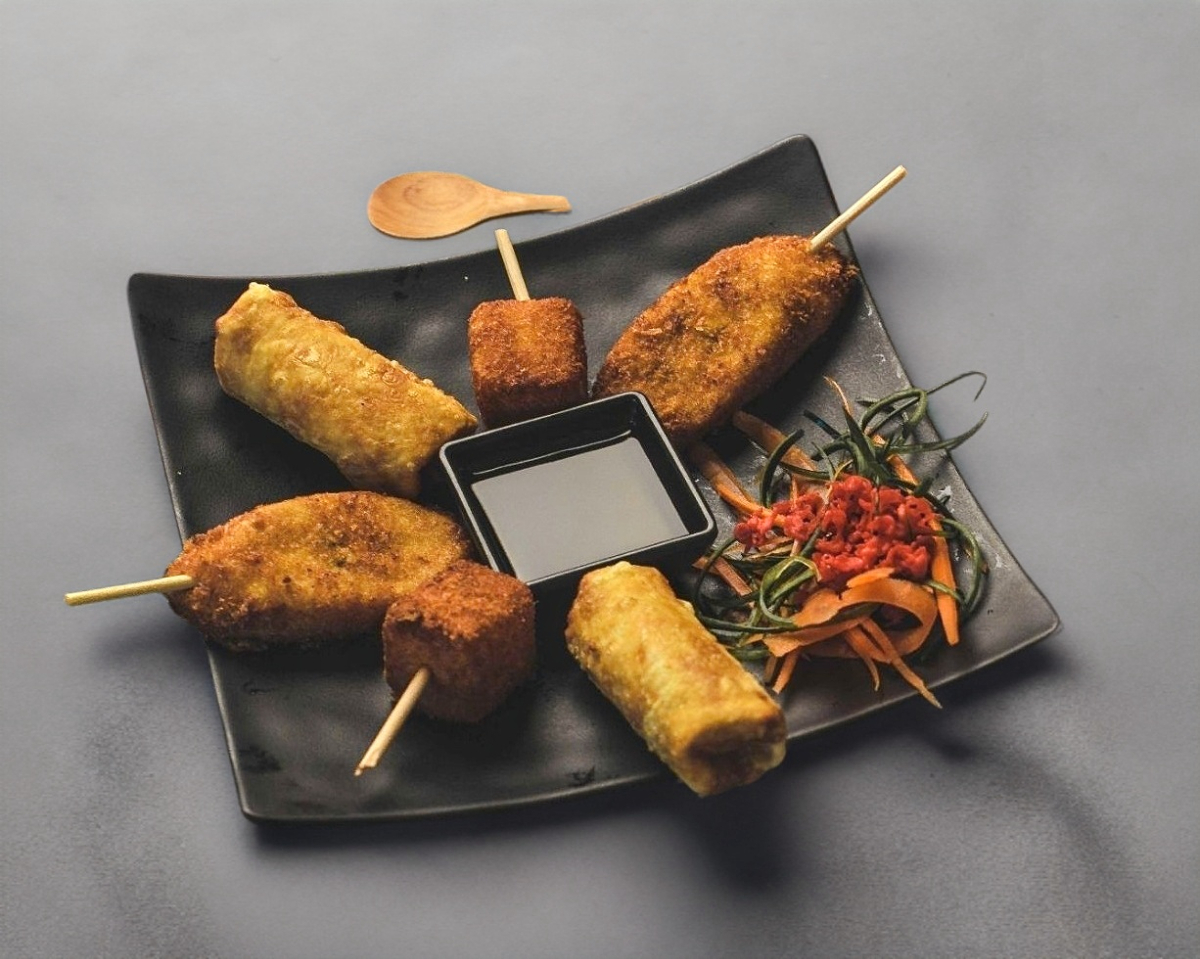 Orden con 2 kushiagues de queso, 2 kushiagues de plátano y 2 rollitos primavera.