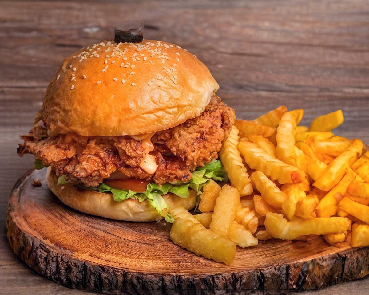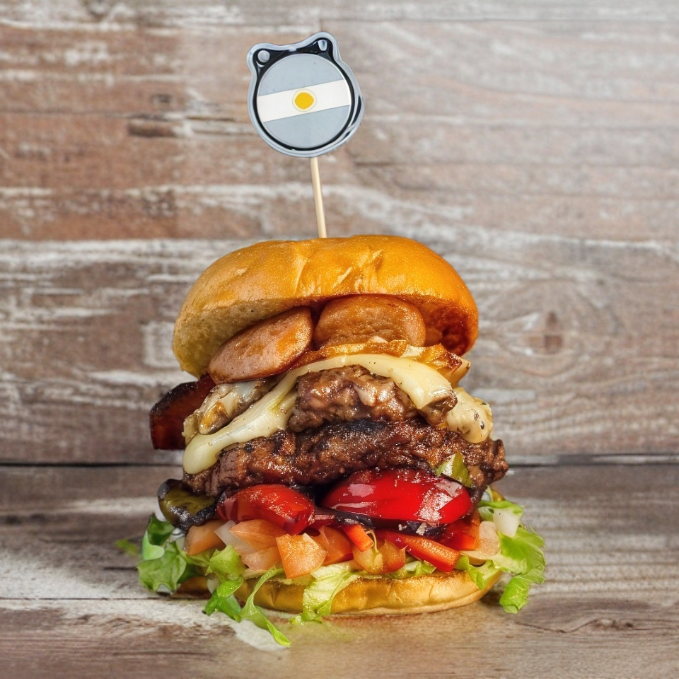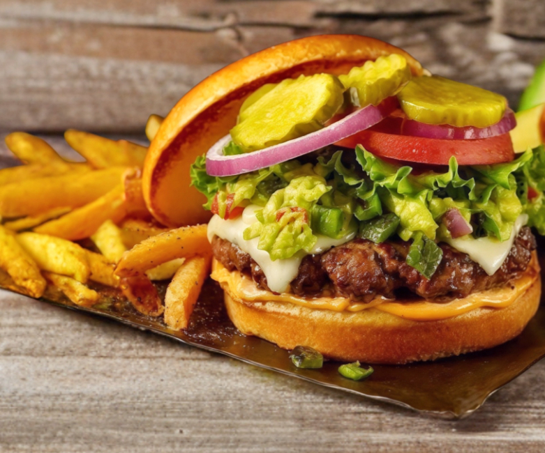 Carne de res, guacamole,queso a la placha, tocino, pepinillos. Jalapeño, vegetales, incluye papas fritas